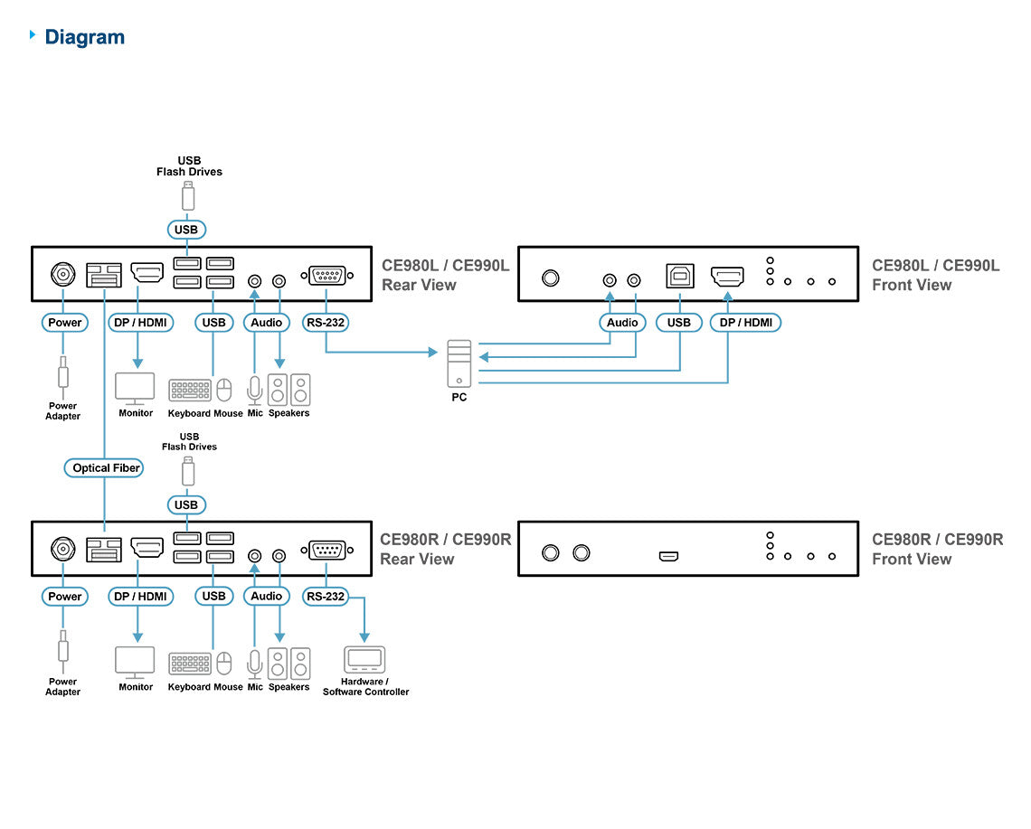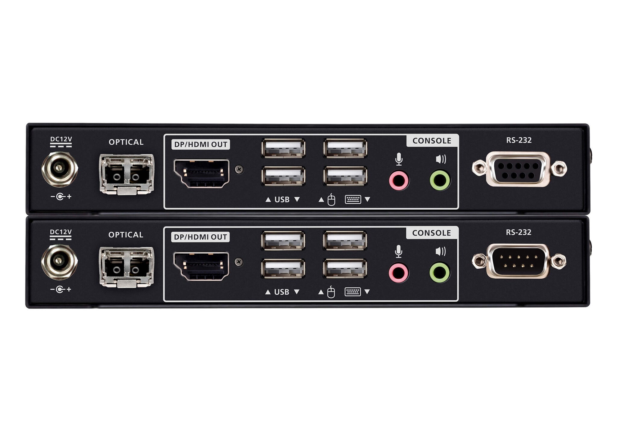 The CE980 is a USB DisplayPort/HDMI Optical KVM Extender that extends KVM signals over fiber-optic transmission up to 300 meters, delivering True 4K, HDCP 2.3-compliant video quality. It features DisplayPort and HDMI connectivity via a combo connector, simplifying installation with selectable video output at both local and remote consoles. In addition to exceptional video clarity, it supports RS-232, USB 2.0 peripherals, and embedded DisplayPort/HDMI digital audio, including Dolby TrueHD, Dolby Digital Plus, and DTS-HD Master Audio, enabling versatile signal extension over a single fiber optic connection. The CE980 is ideal for critical control environments such as healthcare, post production, manufacturing, and more.