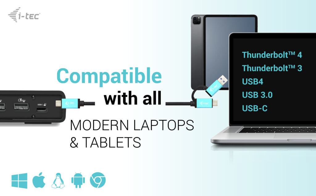 - Universal docking station, compatible with USB-C, USB-A and Thunderbolt laptops & tablets