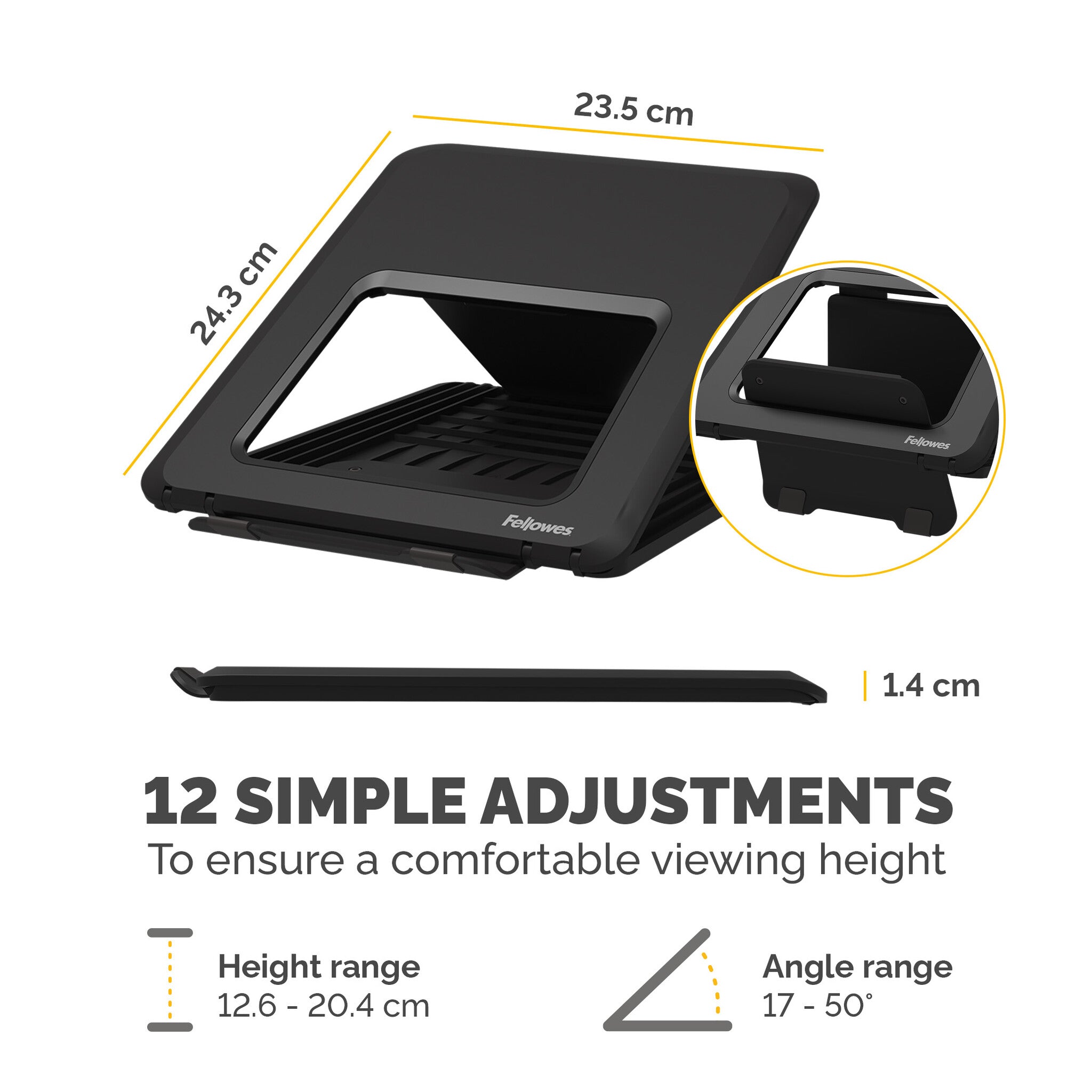 Fellowes Laptop Stand for Desk - Breyta Adjustable Laptop Riser for Home and Office - Portable Laptop Stand with 12 Height Adjustments - Max Laptop Size 14", Max Weight 4KG - Black