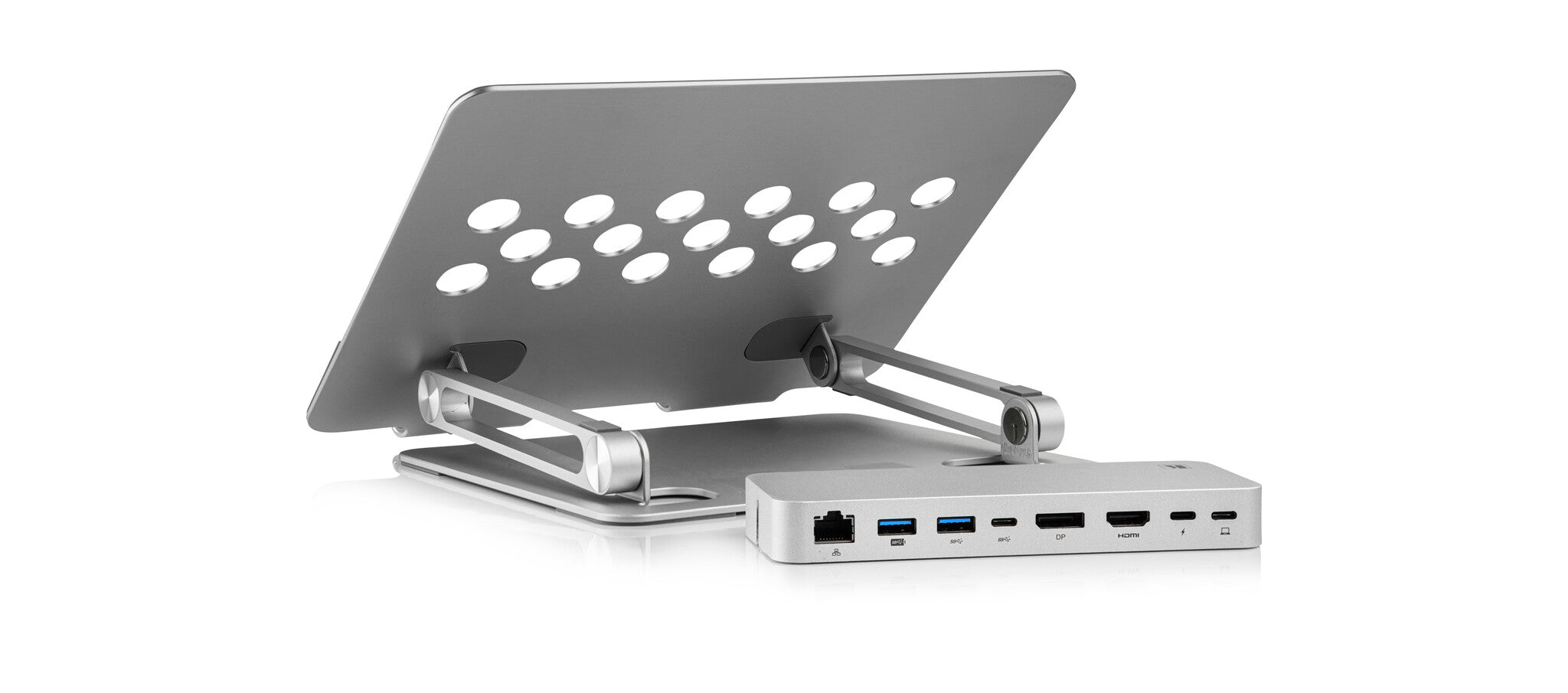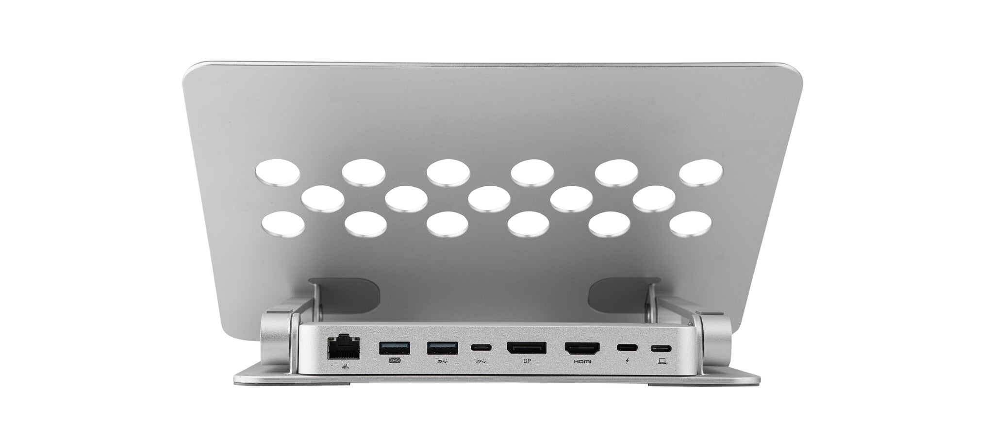 KDock−6 is a USB−C hub multiport adapter and ergonomic laptop stand. It has adjustable height and positioning and is an ideal accessory for MacBooks, laptops equipped with USB Type−C and tablets. KDock−6 can connect your USB−C device to HDMI™, DisplayPort video outputs, 3 USB 3.0 ports, an Ethernet port, an audio and microphone port, and USB−C charging pass−through port.