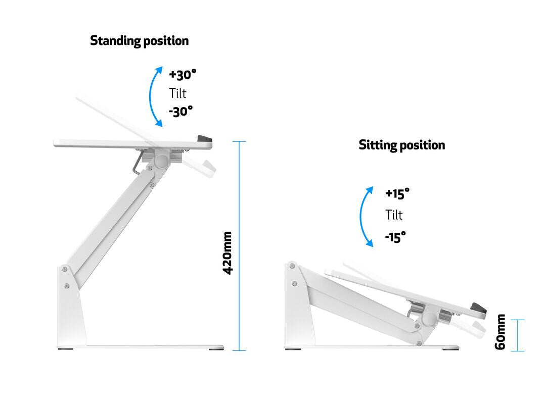 This ingenious product converts any open surface to a workspace. Simply hold the handle on the side of the desk and move your M Laptop Workstation to a standing or sitting position. The worksurface holds your notebook and is ultra flexible to use with your most common accessories.