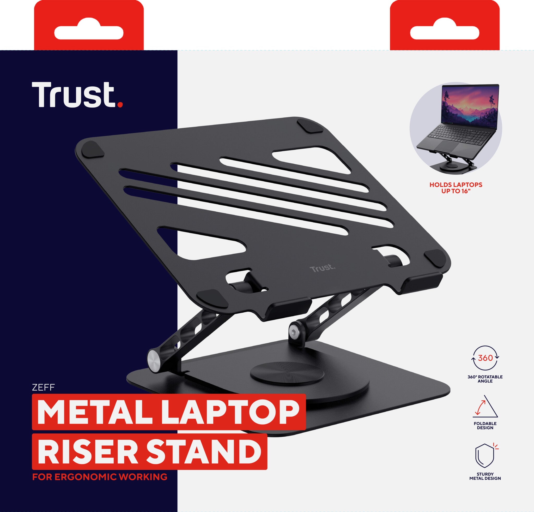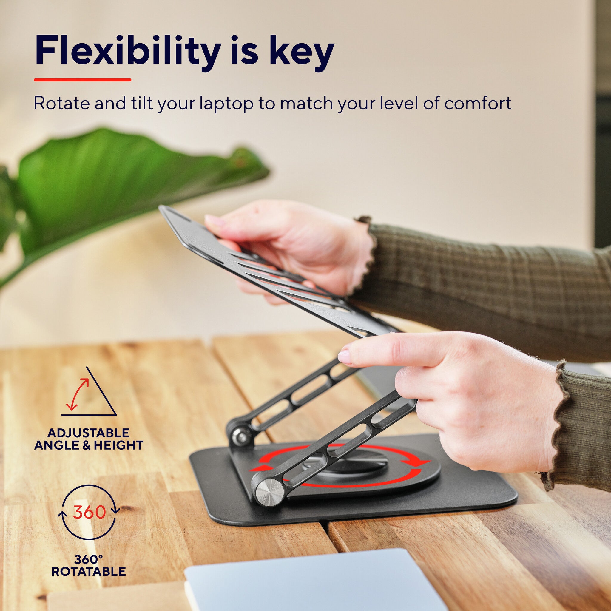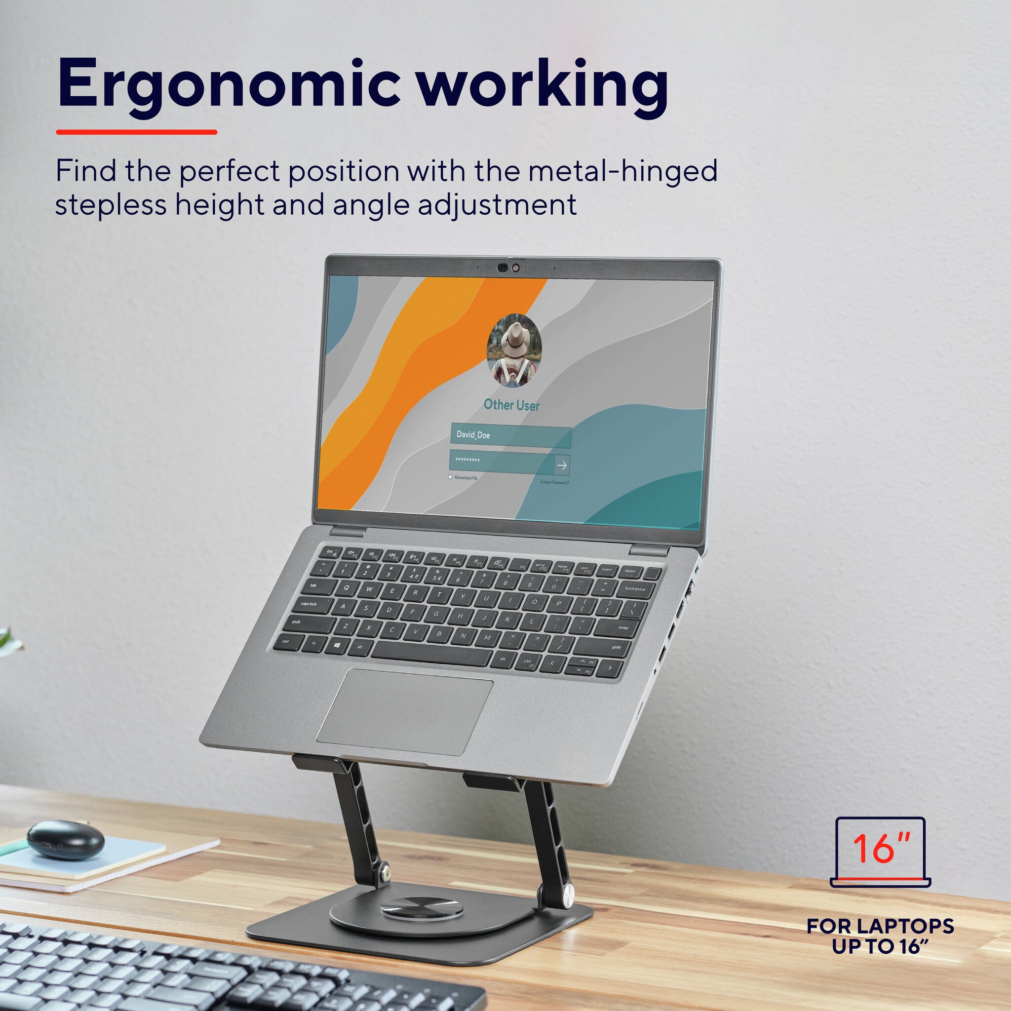 This stand is not going anywhere, literally. Designed to be extra sturdy, it provides a stable base for laptops up to 16”, along with a 360 degree rotatable angle so you can work alone or share your screen when needed.
