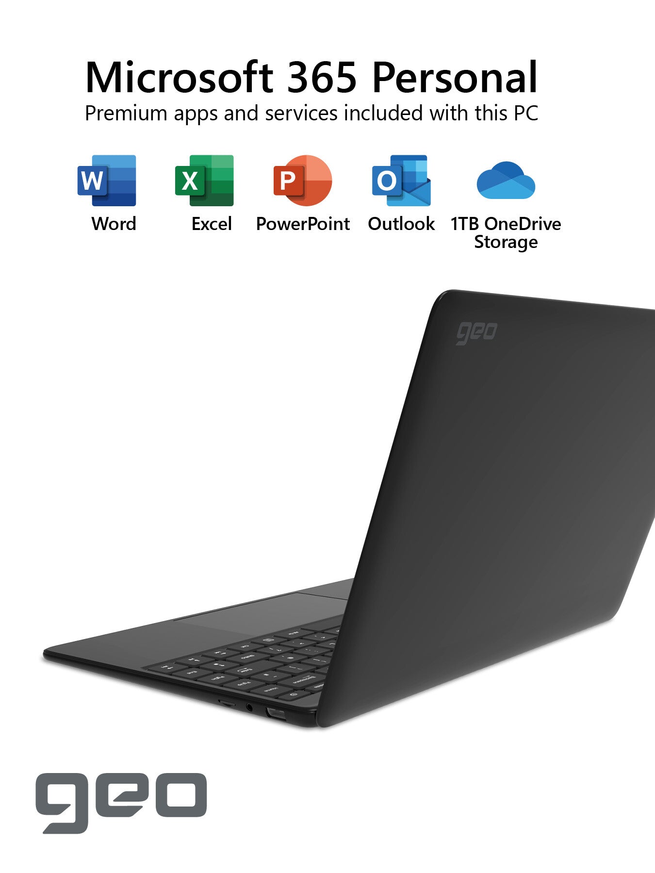 GeoBook 140 comes with Windows 10 Home in S-Mode ready to go. The included one-year subscription to Microsoft 365 Personal provides you with all the tools you need to get started immediately with premium Office apps including Word, Excel, PowerPoint, and Outlook plus 1 TB of OneDrive cloud storage to auto-save, keep in sync, and back up files and photos.