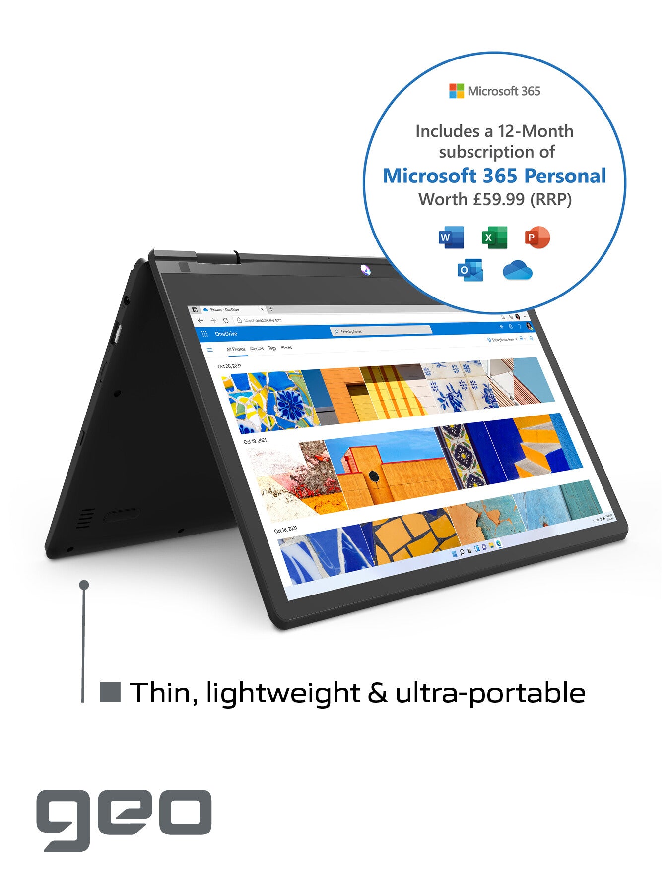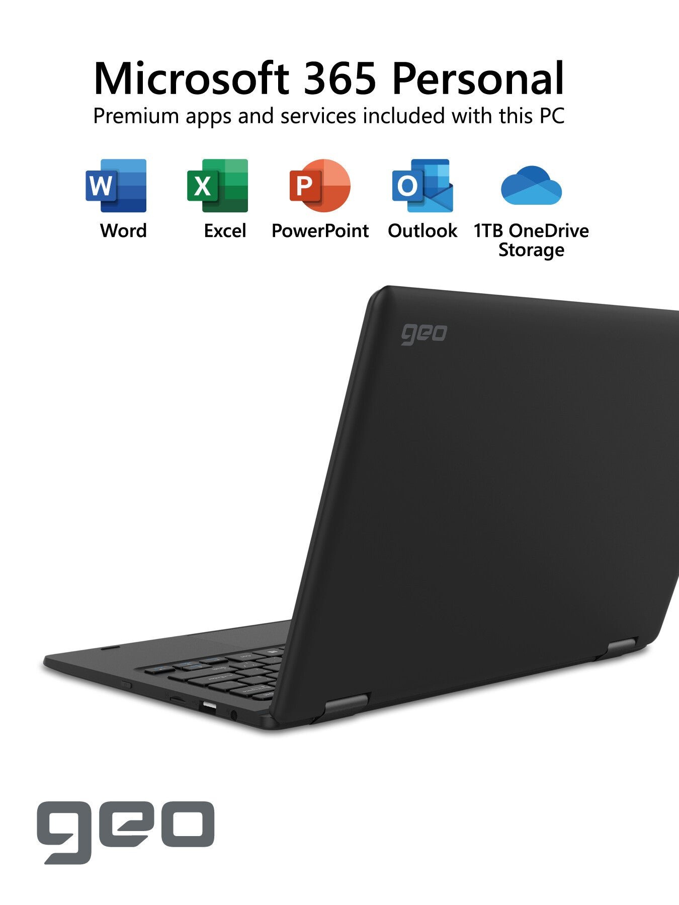 GeoFlex 110 comes with Windows 10 Home in S-Mode ready to go. The included one-year subscription to Microsoft 365 Personal provides you with all the tools you need to get started immediately with premium Office apps including Word, Excel, PowerPoint, and Outlook plus 1 TB of OneDrive cloud storage to auto-save, keep in sync, and back up files and photos.