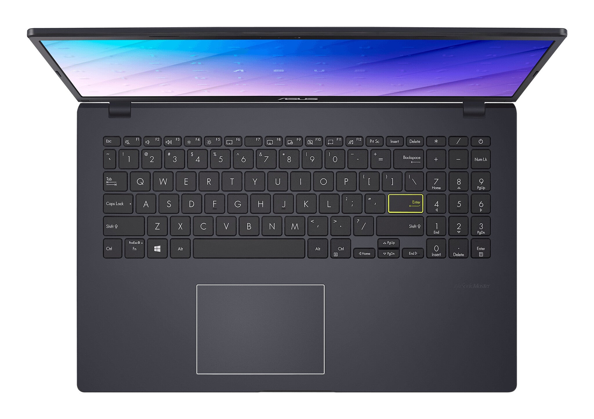 ASUS E510 has a youthful vibe that sets it apart. The lid is detailed with modern slashes that are accompanied by a unique motif made up of a deconstructed ASUS badge. The bold look continues inside, where a bright yellow Enterkey takes center stage. It's something never seen before in laptop design.