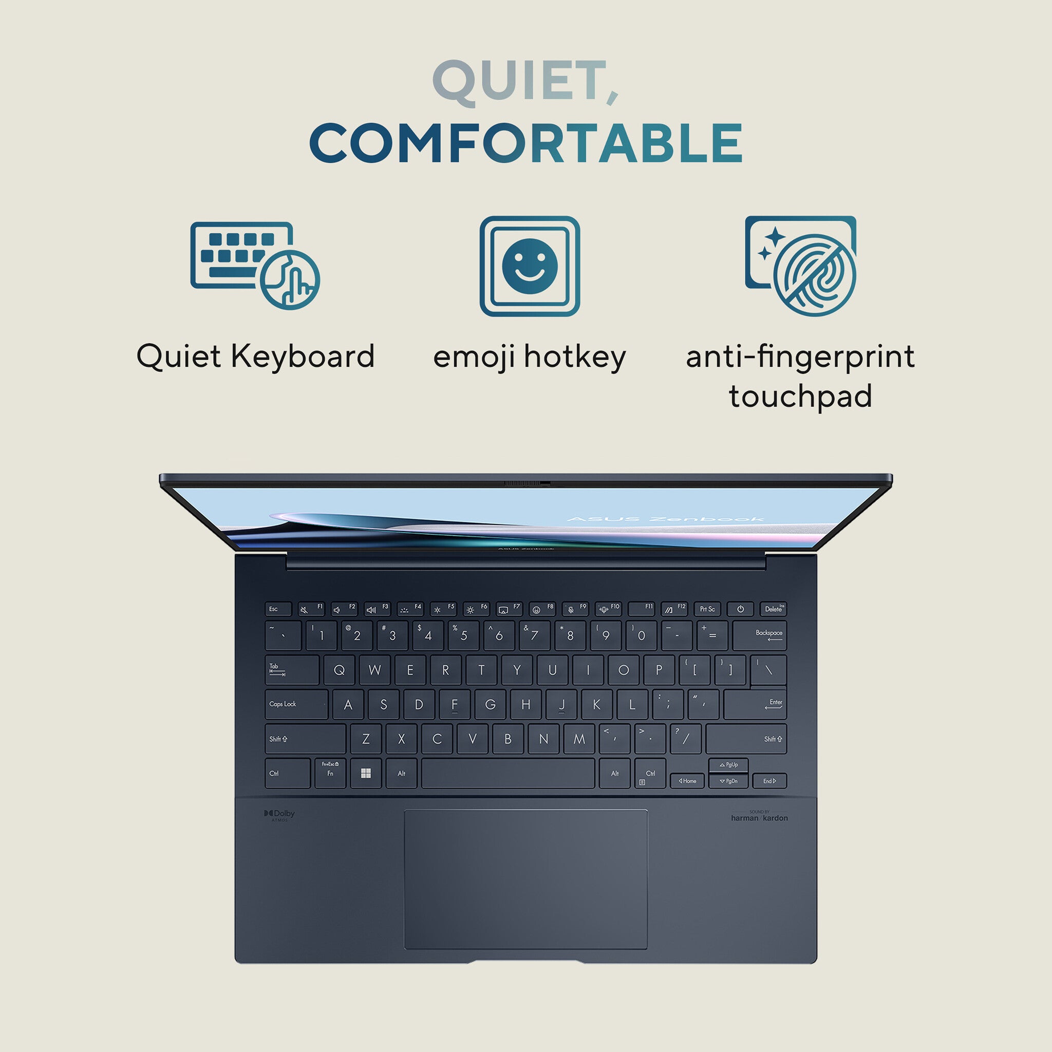 Go the extra mile with the remarkably sleek Zenbook 14 OLED — the ultimate ultraportable laptop that takes sophistication to a whole new level. Seize every moment using the enhanced extended-life battery, amplify your efficiency with the top-tier Intel® Core™ Ultra processor Series 1 and Intel Arc™ graphics, and achieve seamless connectivity via all the essential ports. Immerse your senses in the vivid ASUS Lumina OLED touchscreen* and powerful new Super-linear speakers, while embracing the eco-elegance of the environmentally conscious design.