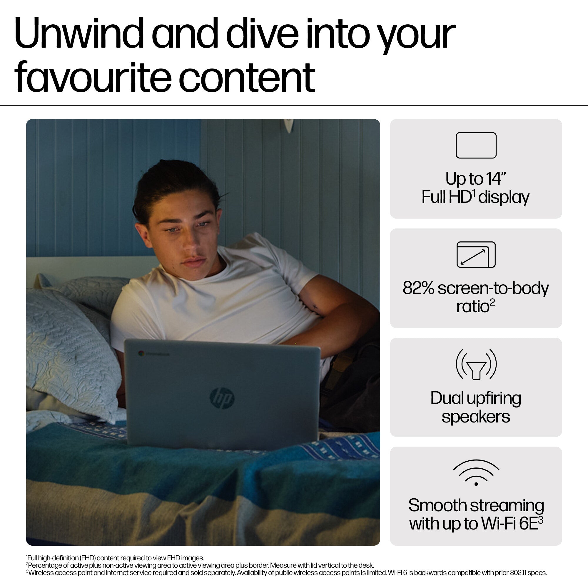 HP Chromebook 14a-nf0002na Intel® N N100 35.6 cm (14") HD 4 GB LPDDR5-SDRAM 128 GB eUFS Wi-Fi 6E (802.11ax) ChromeOS Silver