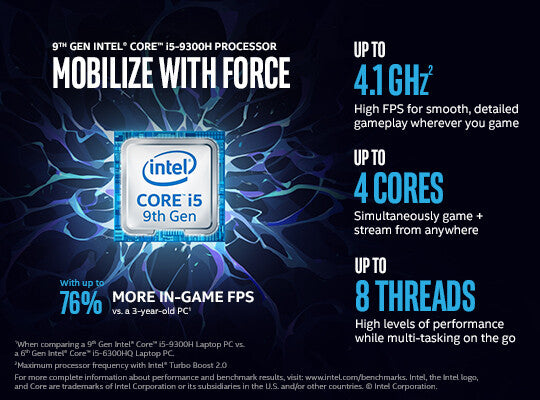 - Intel® Core™ i5 i5-9300H 2.4 GHz Processor cores: 4