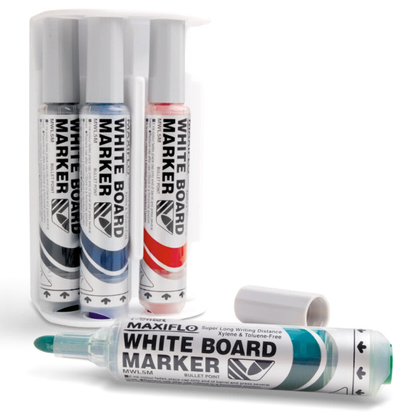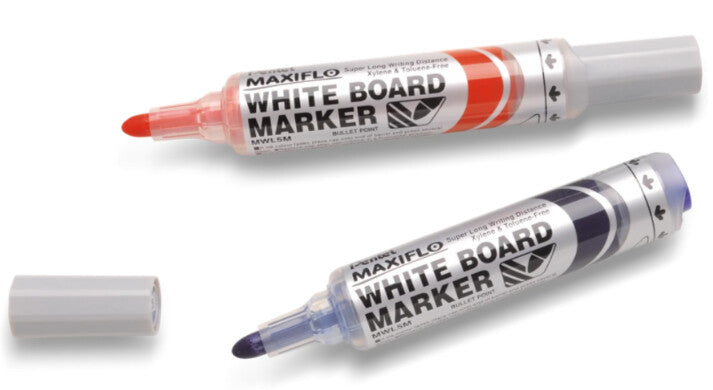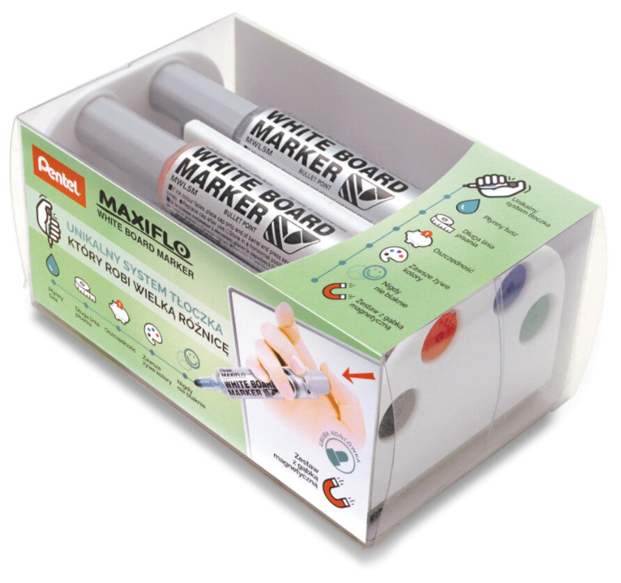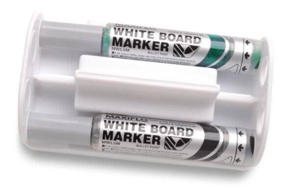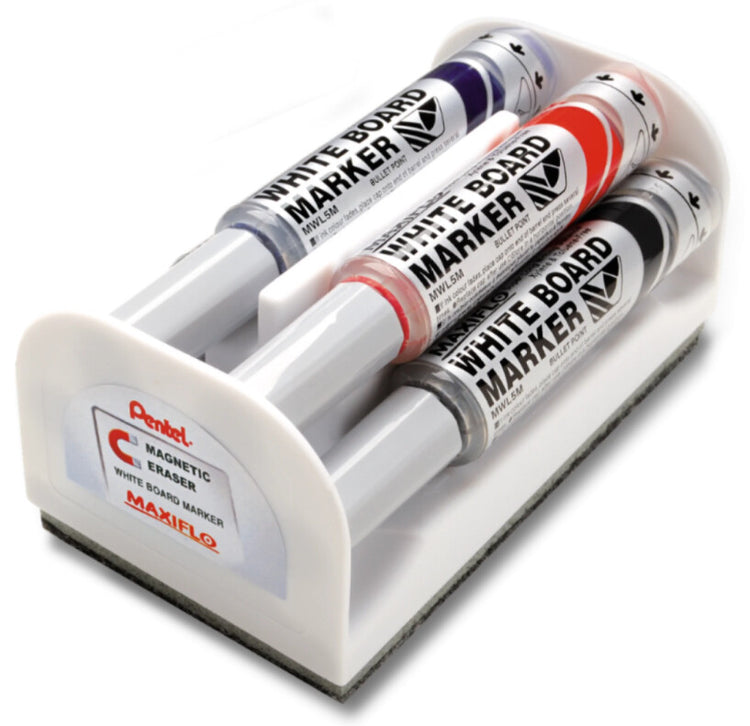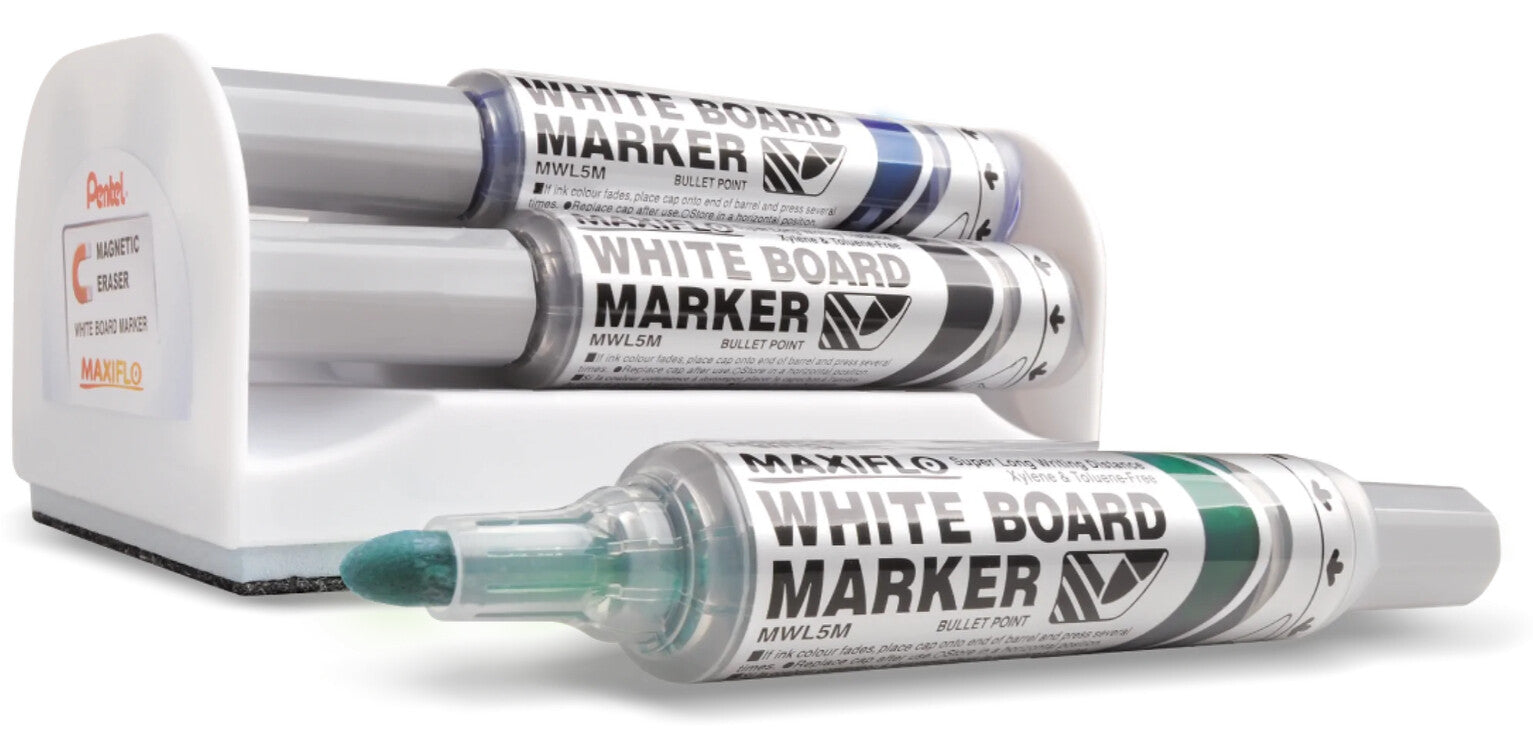 The Pentel MWL5M dry wipe eraser set has 4 medium bullet tip markers which provides long-lasting ink and vivid colours. It incorporates a magnetic eraser which can be safely left on a wipe board. It’s suitable for classroom or meeting presentations on white or porcelain boards. It’s a high quality, long lasting dry wipe marker. It has a unique pump action system to replenish ink supply if the tip has dried out. Its medium bullet tip provides an approx. line width of 3mm
