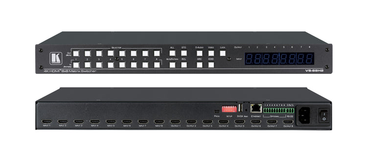 VS−88H2 is a high−performance 8x8 matrix switcher for 4K@60Hz (4:4:4) HDR signals and digital audio routing. It reclocks and equalizes the signals and can route any one of 8 HDMI, HDCP−compliant sources (selectable) to any or all outputs simultaneously. VS−88H2 offers unmatched audio flexibility where any embedded digital audio input can be routed to any digital output in addition to eight ARC sources to produce an equivalent 16x16 audio matrix.