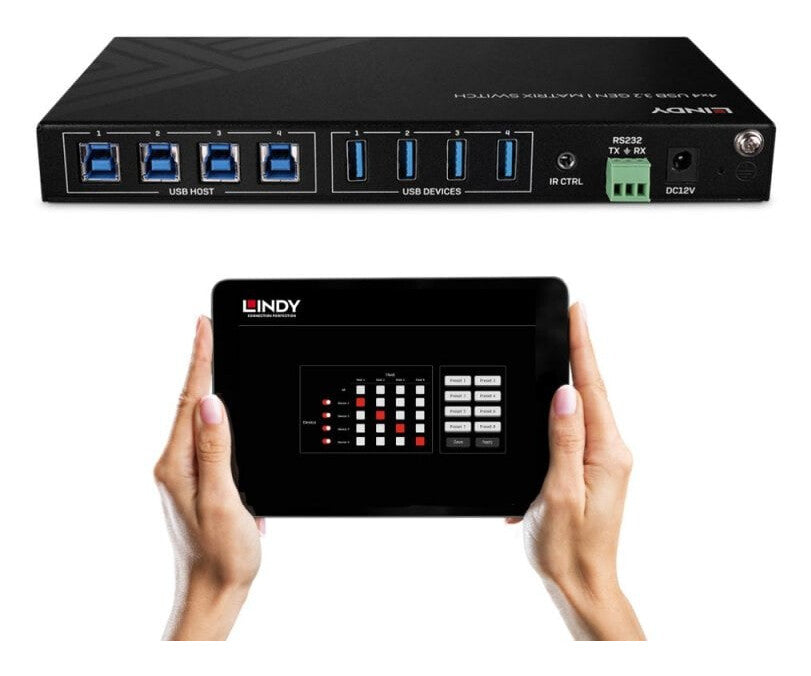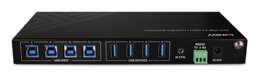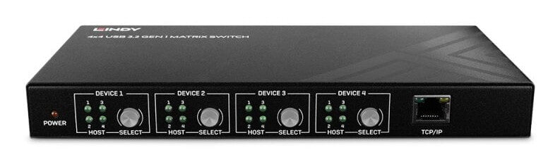 The Lindy USB 3.2 Gen 1 Matrix Switch allows the user to share up to 4 USB devices to up to 4 hosts in many different ways: by pushing the buttons on the front panel, via web GUI and using RS-232 commands.