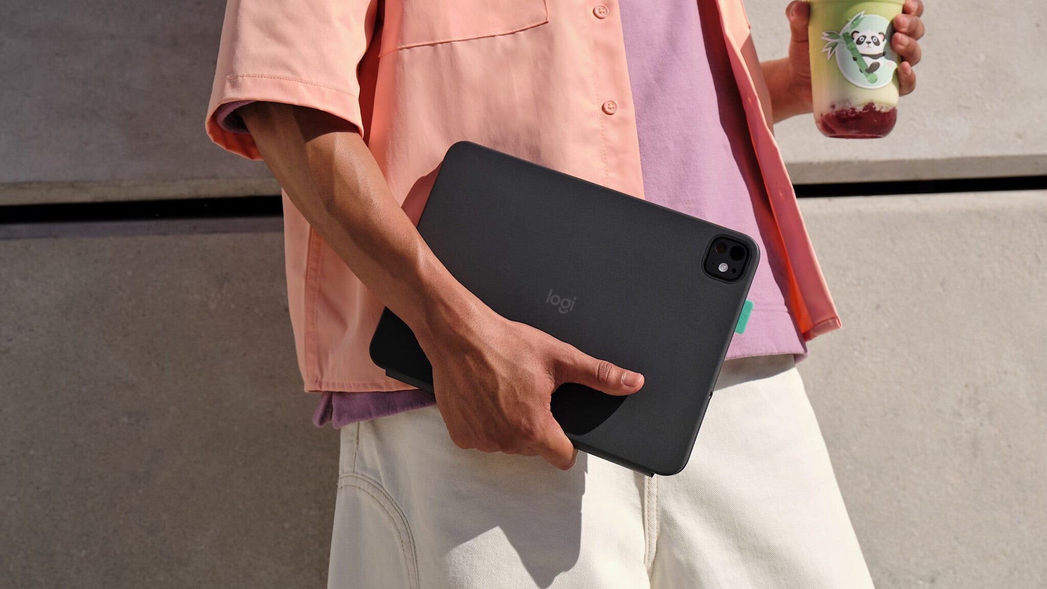 Flip into fun. Or focus. Detach the Bluetooth keyboard and place it anywhere. Then snap it back onto the case magnetically to stow it away. Adjust the kickstand to find the right angle, and position iPad in landscape or portrait modes.