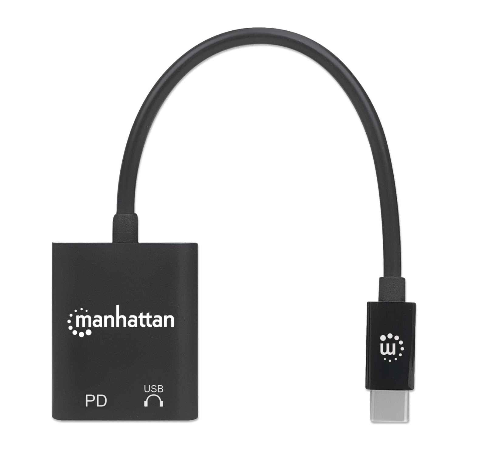 Manhattan USB-C to USB-C Audio Adapter and USB-C (inc Power Delivery), Black, 480 Mbps (USB 2.0), Cable 11cm, With Power Delivery to USB-C Port (60W), Three Year Warranty