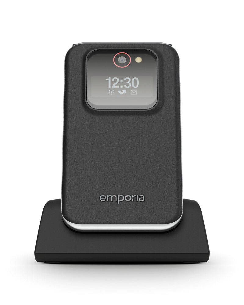 "Joy" means something like "joy" or "happiness" in English. And this name says it all with the emporiaJOY. Because it's simply fun to pick up this handy flip phone, to make calls with it or to take pretty snapshots. An ideal everyday companion that will win you over. We have equipped the popular seniors' cell phone with charging cradle with a robust, durable hinge, so that you will enjoy this device for a long time. Then there are the speed dial buttons - ideal for getting important things done quickly. The 1.1 inch external display and the 2 MP camera also catch the eye. And the icing on the cake? The 2.8 inch main display. In combination with the easy-to-grip buttons, this guarantees easy phone calls. But the emporiaJOY will also make you happy in terms of safety and hearing experience: The device is IP54-certified, meaning it is dust and splash-proof, and is particularly interesting for hearing aid wearers (M4/T4). You also don't have to do without our patented emergency call button, which is located on the back, with this phone. Whether you choose a black or red emporiaJOY or prefer the shade "Blueberry" - each of these senior cell phones comes with a charging cradle. Also included in the delivery are: battery, USB-C cable, operating instructions and an additional battery cover for the emergency call button.