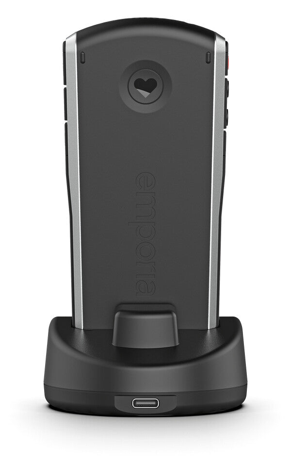 Often less is more. The new emporiaSIMPLICITY (simple = easy) is a compact keypad phone with a high-quality finish and a stylish design. The SIMPLICITY has no frills. The focus is on what telephones were originally invented for: making phone calls. This works perfectly thanks to three speed dial keys, easy operation, extra-large keys (illuminated, raised and with an excellent pressure point), individually adjustable font size and a wide screen with easy-to-read font. The phone is IP54 certified (dust and splash proof) and is particularly suitable for hearing aid wearers (M4/T4). The back of the phone is equipped with the tried and tested, patented emporia emergency call function, which allows you to call for help quickly and easily. Simply press the button with the heart and the rescue chain is activated. Other functions include an LED flashlight, calendar with reminder function, calculator, alarm clock, vibration alarm and radio. The scope of delivery includes headphones, operating instructions and a replaceable Li-Ion battery.