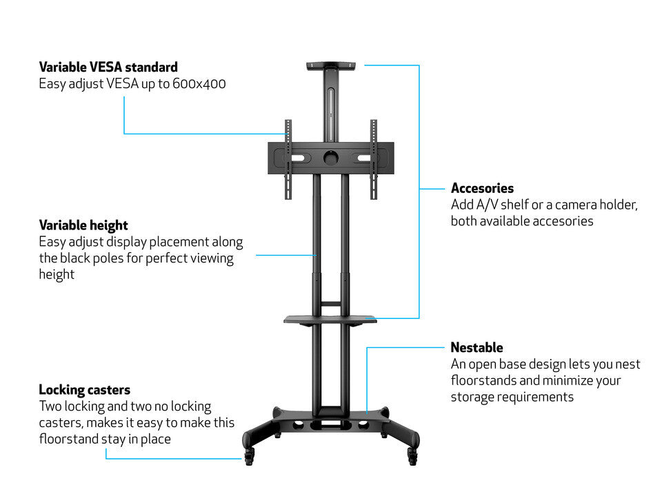 The Multibrackets Floorstand Basic Frontshelf is the perfect solution. It can carry up to 10 kg. The Frontshelf has an easy adjustable length of arms and it can also be moved up or down within the pillar of the stand.