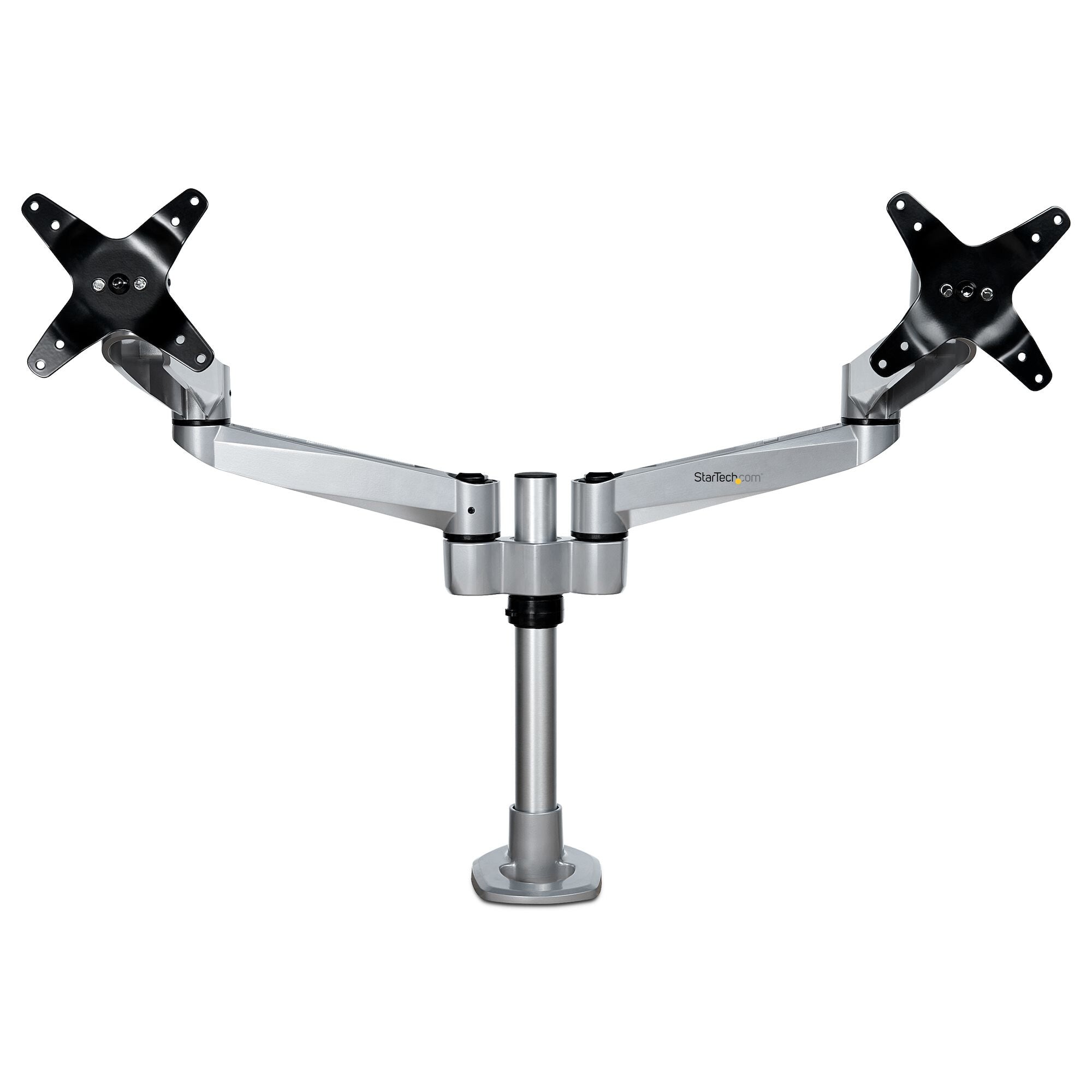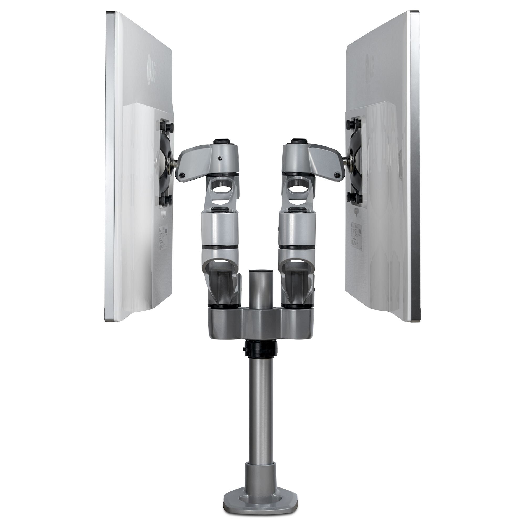 Create an ergonomic workspace with this premium desk-mount dual monitor arm, for monitors up to 30" each. The two articulating monitor arms with dual-swivel action offer a wide range of motion side to side. The attractive silver finish enhances the aesthetics of your workspace.