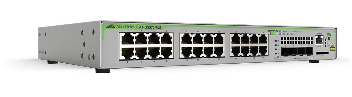 The Allied Telesis CentreCOM® GS970M/28 Layer 3 managed switch features twenty-four 10/100/1000T Gigabit Ethernet ports and four 100/1000X SFP ports for secure connectivity at the network edge.
