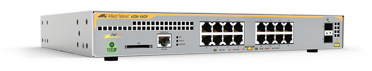 The Allied Telesis x230-18GP features 16 x 10/100/1000T PoE+ ports with 2 SFP Gigabit uplink ports. A full feature-set with Power over Ethernet Plus (PoE+) makes it ideal for applications at the network edge, supporting the growth of wireless networking and digital video surveillance.