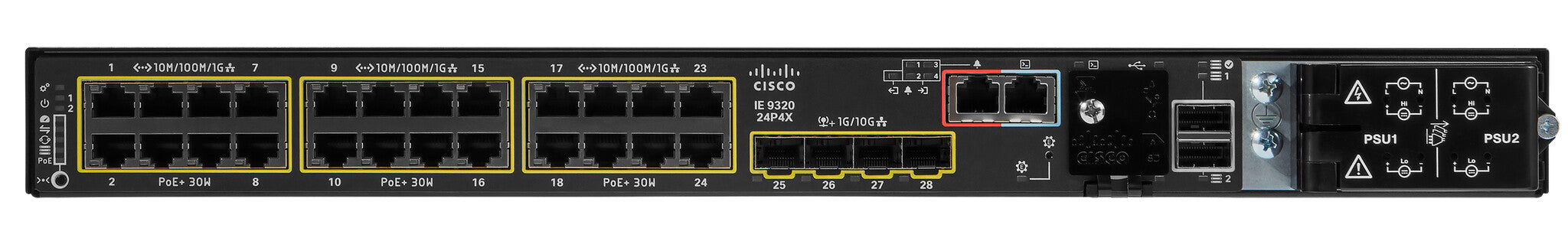 Cisco Catalyst IE9300 Rugged Series switches with 28 ports of Gigabit and 10 Gigabit Ethernet interfaces deliver high-speed Ethernet connectivity in a compact form factor and are designed for a wide range of industrial applications for which hardened products are required. The platform is built to withstand harsh environments in manufacturing, energy, transportation, mining, smart cities, and oil and gas. The switches are ideal for outdoor enclosures or harsh environments while adhering to overall IT network design, compliance, and performance requirements.