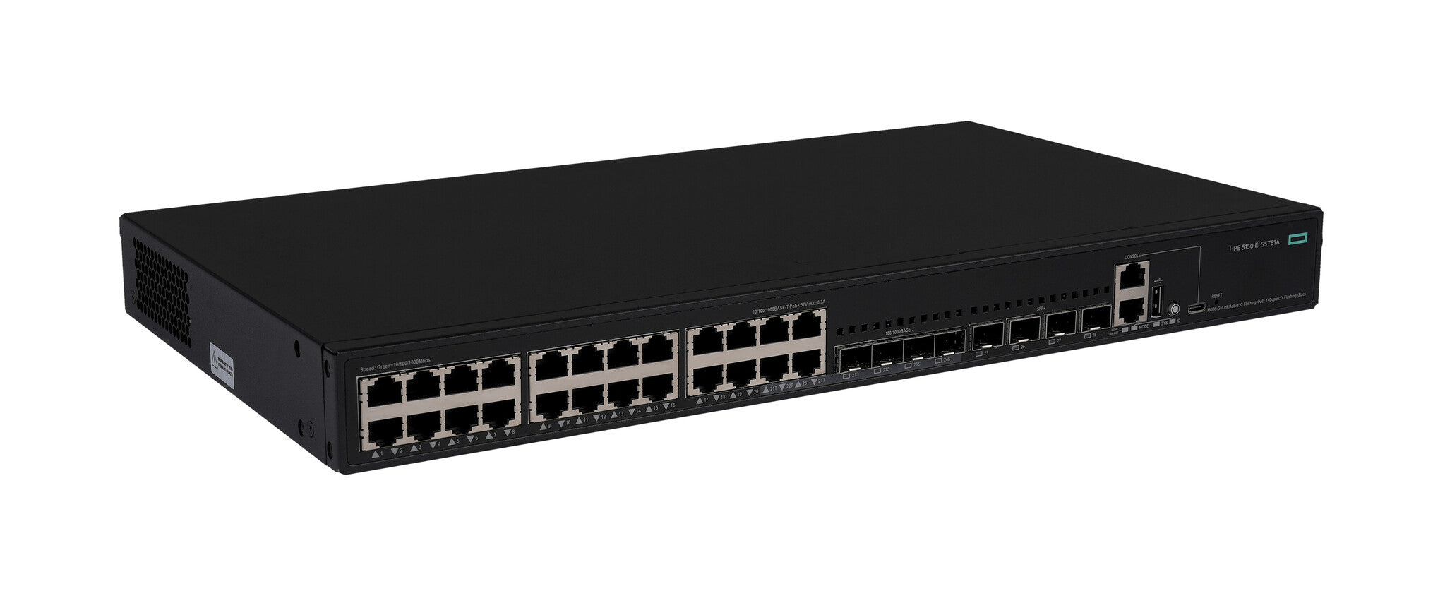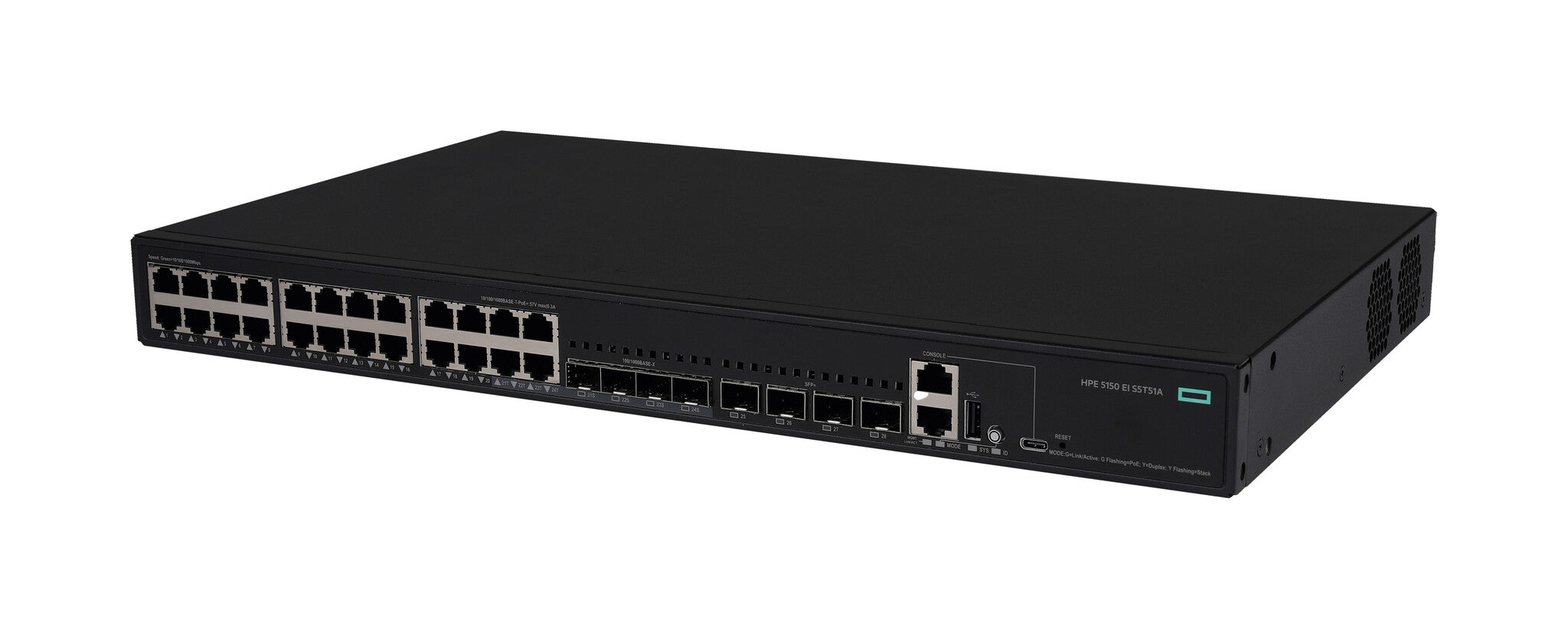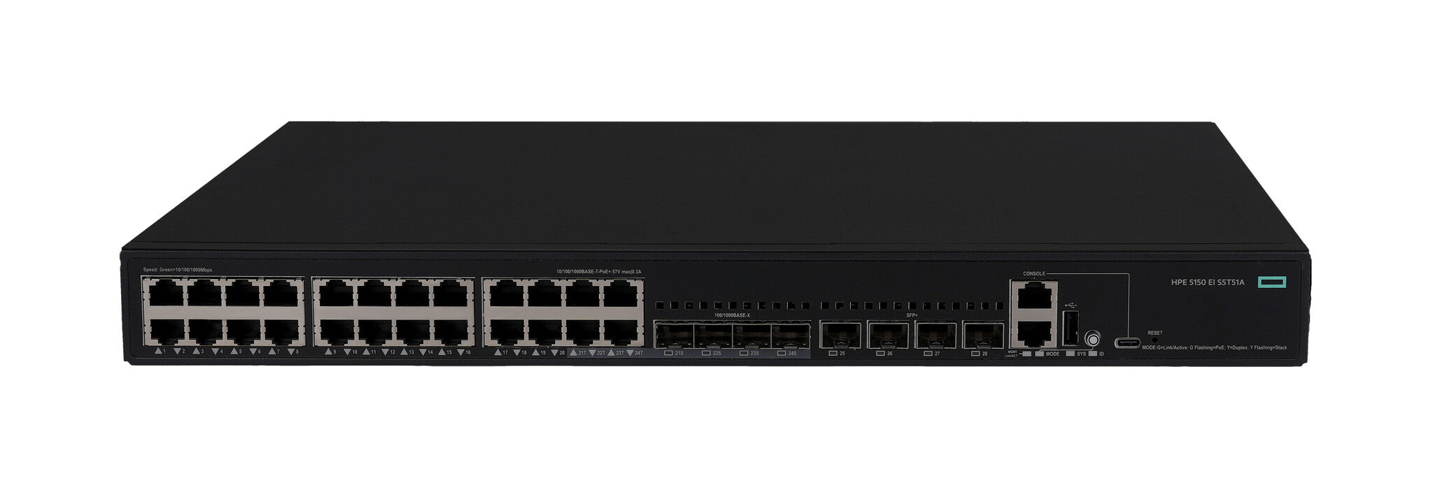 The HPE Networking Comware Switch Series 5150 EI is a family of stackable L3 access switches powered by HPE Comware OS delivering scalability and resiliency at a modest TCO for small, medium, and large enterprise campus networks. With 8, 24, and 48 gigabit ports, options for mixed copper and fiber connectivity, and up to 30 watts of 802.3at PoE per port this flexible series is ready to connect your edge clients, servers, and IoT devices. Built-in 10 GbE uplinks and Intelligent Resilient Fabric (IRF) stacking up to 9-members adds scale, resiliency, and simplification to your access network, enabling network operators to manage the whole stack as a single logical switch. Network visibility, management, and operation tools for this series include standard CLI and the Smart Management Center (SmartMC), embedded and ready to use at no additional cost. The series integrates with HPE Aruba Networking IMC, delivering a centralized point of control for your entire network.