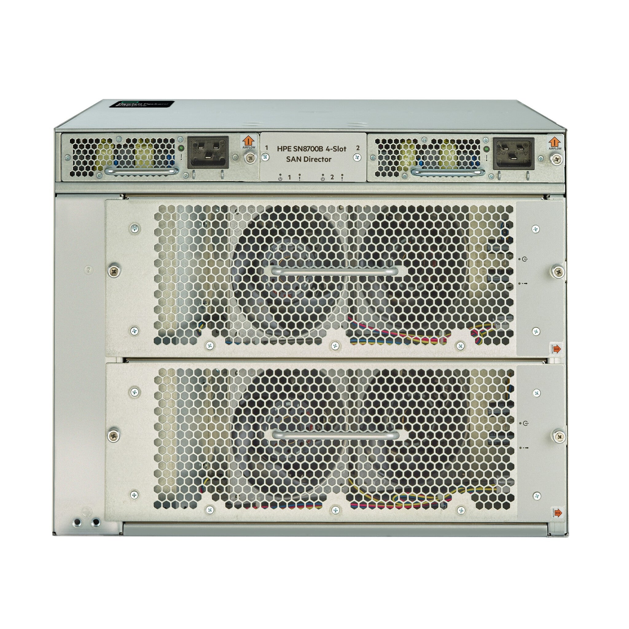 HPE Storage Fibre Channel Switch SN8700B 64Gb SAN director is offered with the flexibility of both Non-Port side Intake (NPI) and with Non-Port side Exhaust (NPE).
