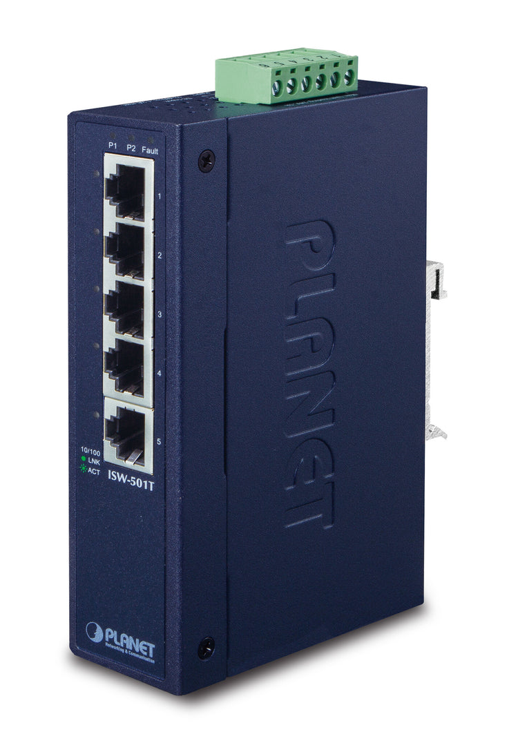 PLANET ISW-501T, an Industrial 5-port Fast Ethernet Switch, provides non-blocking wire-speed performance in harsh industrial environment. It also provides 5-port 10/100BASE-TX RJ45 copper interfaces delivered in an IP30 rugged, strong case with redundant power system. Its slim case is suitable for such applications as surveillance system deployments, control management and wireless service in climatically demanding environments with wide temperature range from -40 to 75 degrees C.