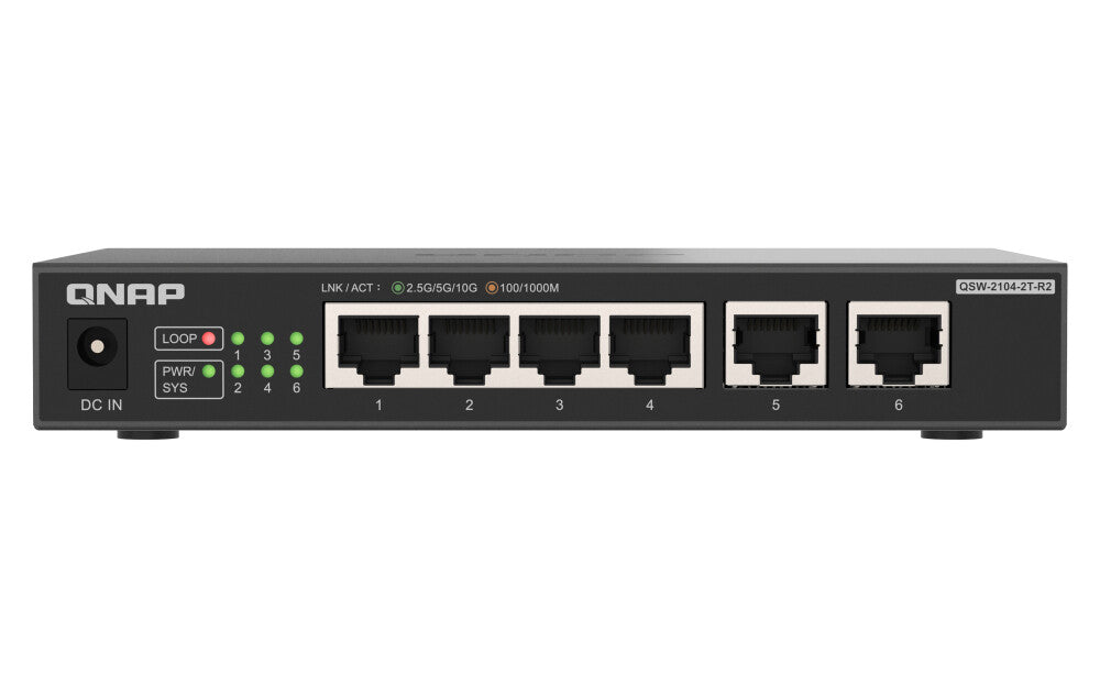 Upgrade now with our wallet-friendly compact 6-port high-speed switch! The QNAP QSW-2104-2T-R2 unmanaged switch with four 2.5GbE ports and two 10GbE ports allows you to upgrade to stable high-speed networking at an affordable price. Integrated seamlessly with Wi-Fi 6/6E/7 for optimal wireless network performance, the QSW-2104-2T-R2 is perfect for offices and multimedia teams, providing high-speed data transfer, large file sharing, and efficient collaborative workflows. The QSW-2104-2T-R2 is made in Taiwan (MIT), providing a high-quality and reliable networking solution.