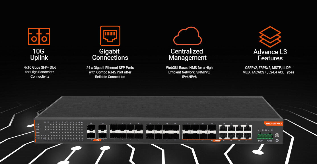 The SilverNet 716S8C4M is reliable and sturdy, adhering to IEEE802.3, u, z, ab, x, az, ah standards, as well as IEEE802.1X + 802.1Q.