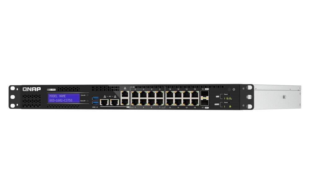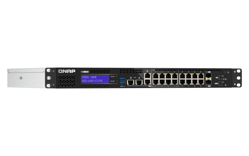 The QGD-1602 uses Intel® Atom® C3000 series multi-core 2.2GHz processors, has two SATA drive bays, and provides and two M.2 NVMe SSD slots for SSD caching to increase IOPS performance. Two PCIe Gen3 x2 slots allows users to install 10GbE network cards, QM2 dual-port M.2 SSD/10GbE cards, USB 3.2 Gen 2 (10Gbps) cards, or Wireless Adapters to boost core functionality. The QGD-1602 also supports Intel® QuickAssist Technology (Intel® QAT) to greatly enhance IPsec VPN performance.
