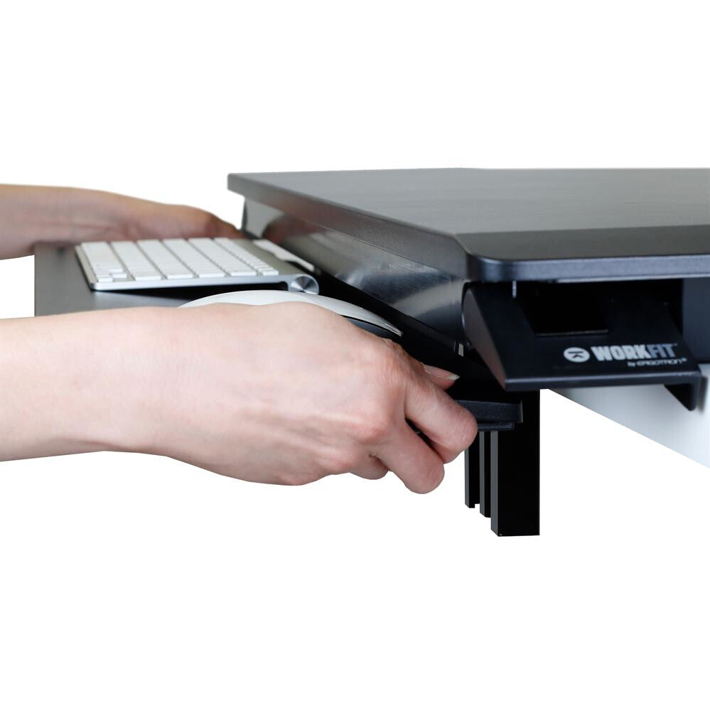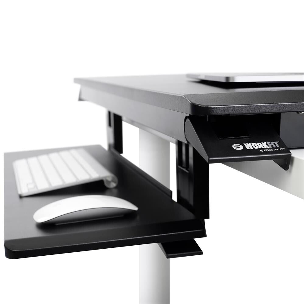 - Height-adjustable drop-down tray places your keyboard at the most comfortable position