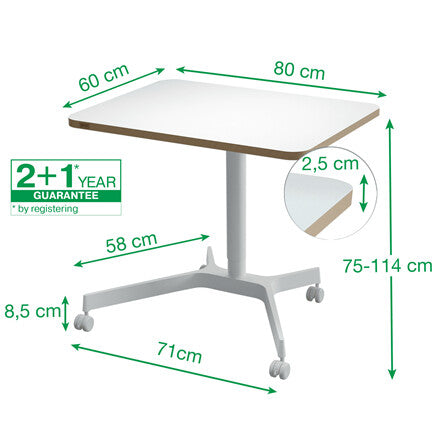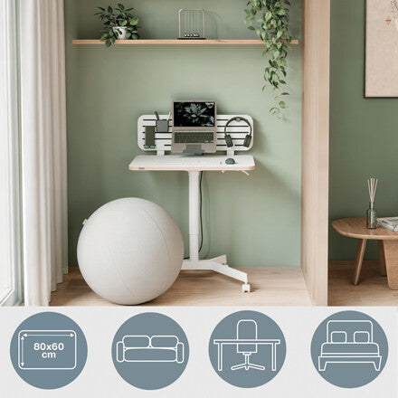 SIT - STAND - MOVE. Whether you‘re aiming for a healthier lifestyle or want to avoid aches and pains while working, our space-saving mobile sit stand desk will elevate your workspace to new heights.The compact design with a 80 x 60 cm desktop is ideal for flexible use and as a temporary desk where space is limited. Perfect as a small home office desk or for hot desking areas or meeting rooms it provides space for a laptop, keyboard and other accessories e.g. wrist rests and mouse mats. Combined with the clever Leitz Ergo Pegboard Organisers (available for separate purchase) to create vertical storage and keep your desk tidy. This desk has a smooth pneumatic height adjustment feature allowing you to find the perfect ergonomic position. Easily switch between sitting and standing to promote muscle movement and which has a positive impact on wellbeing. The 4 locking castor wheels make the desk easy to move when required. This modern and minimalist sit-stand desk is ideal for your home or office to enhance comfort and maximise productivity. It's our mission to provide solutions that can empower individuals to thrive at work and beyond promoting positive mental health and physical wellness. Combine with many other Leitz Ergo products to customise your flexible and individual sit, stand & move workstation. Stay active and FEEL GOOD with Leitz.