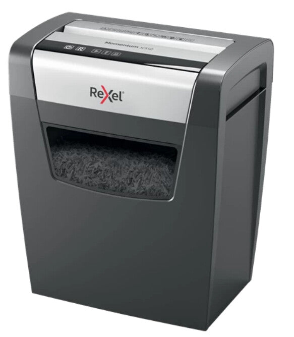 The power to shred more! The Momentum X312 paper shredder shreds up to 12 sheets (80 gsm) in to P-3 (5x42mm) cross cut pieces, with a 23L bin which holds 200 A4 sheets.
