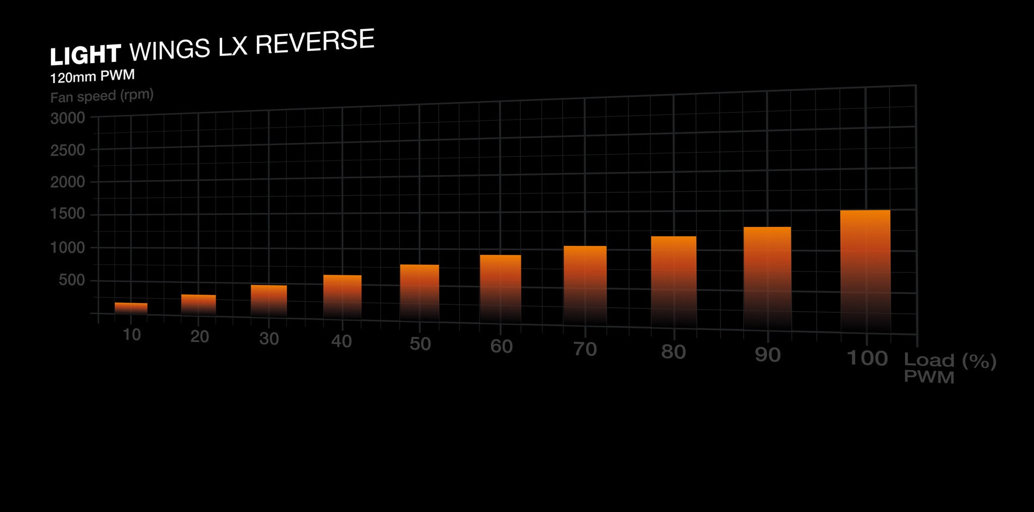 The Light Wings LX 120mm PWM Reverse White boasts reversed fan blades and an illuminated impeller for great performance and lighting. This fan will take your system to the next level. The Light Wings LX 120mm PWM Reverse White is particularly suited for color-rich ARGB builds. Not only does the fan provide unmistakable, high-quality lighting, but also reliable cooling.