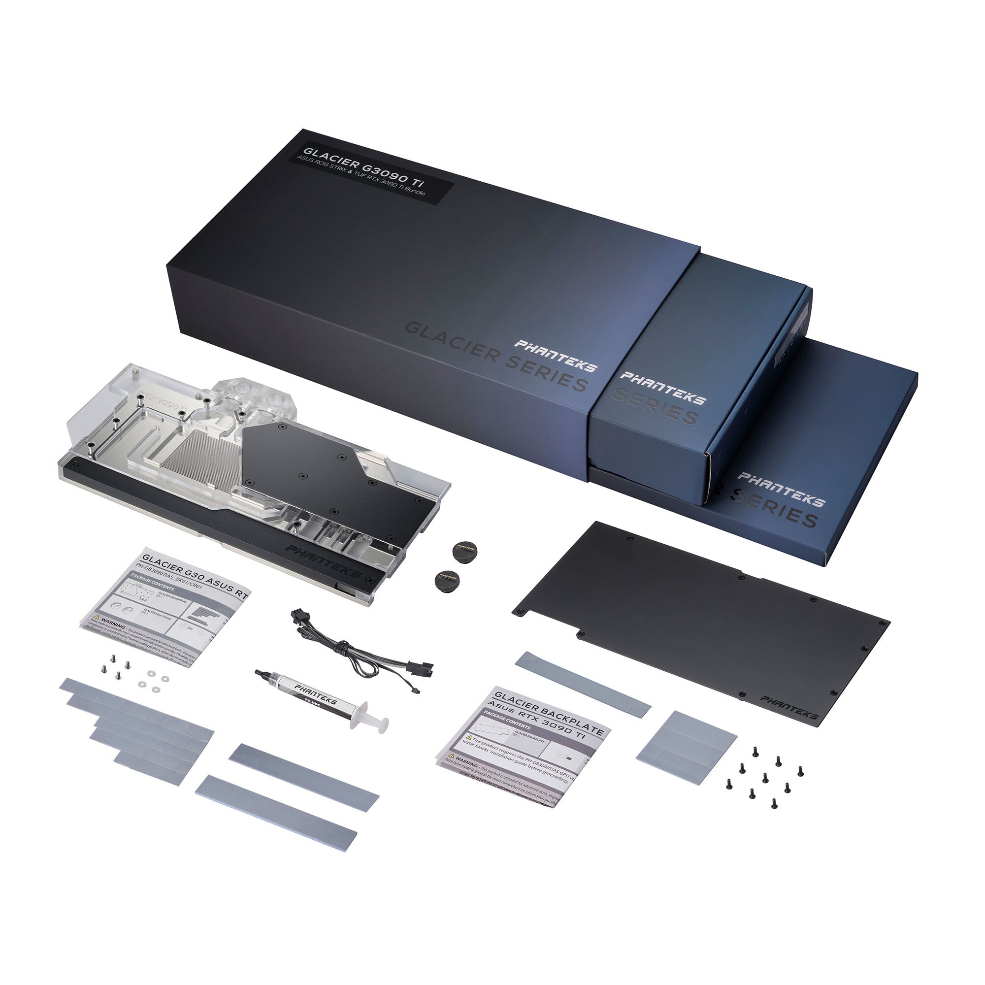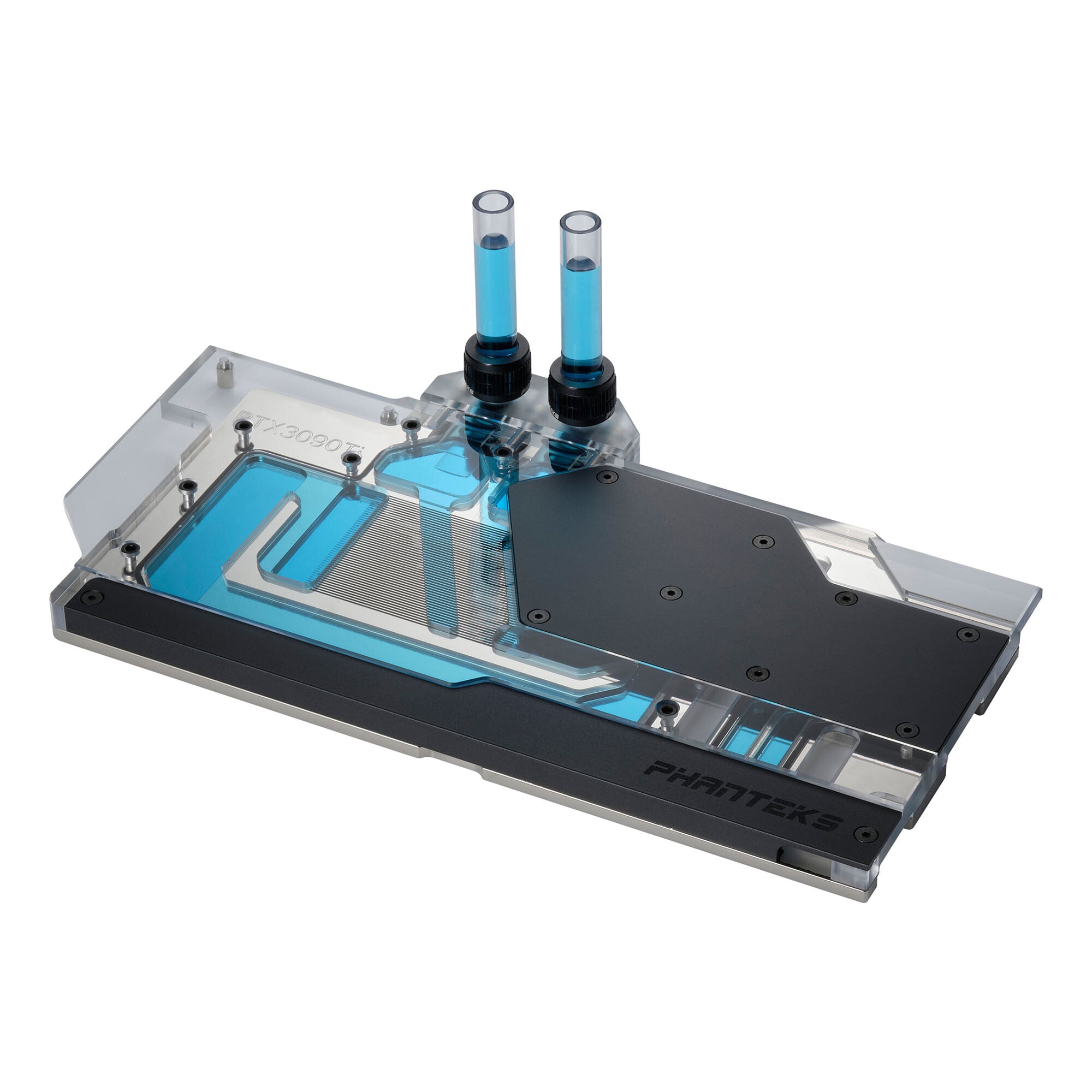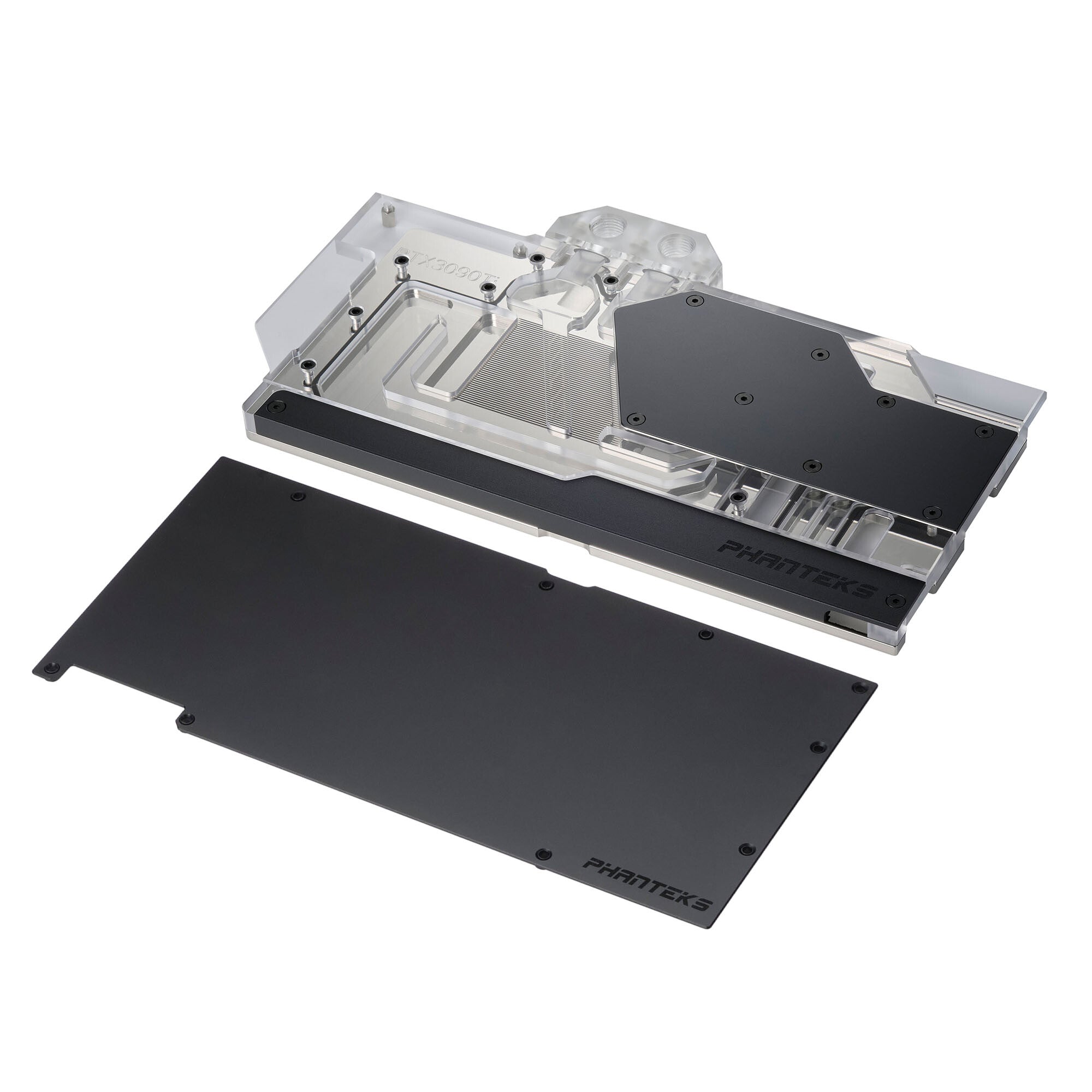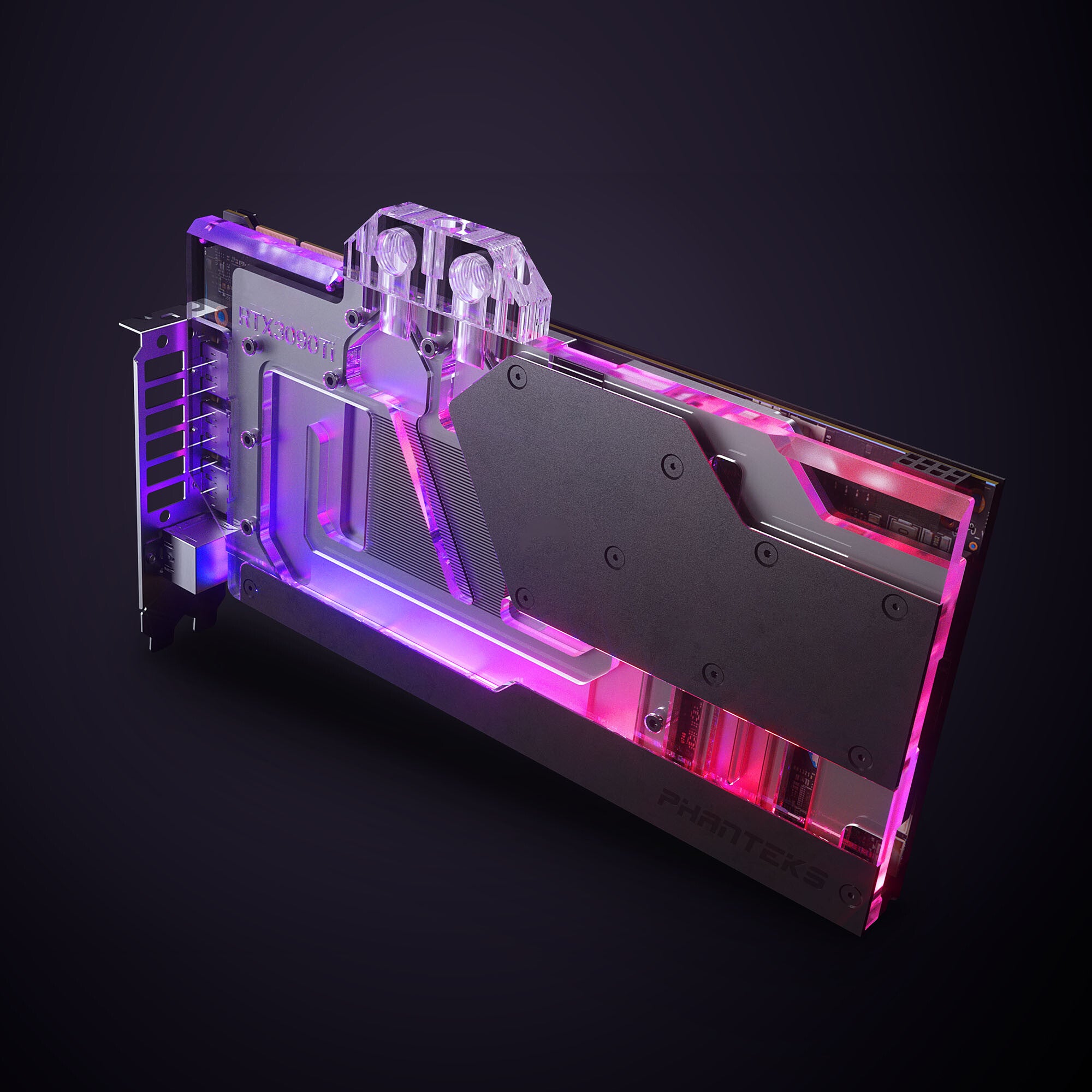 Phanteks’ Glacier G30 Asus 3090 Ti provides a high-performance water-cooling solution custom-designed for the latest Asus ROG Strix LC / TUF gaming RTX 3090 Ti cards. Designed using premium materials, the Glacier G30 Asus 3090 Ti features an aluminum cover, nickel-plated copper base, clear transparent Acrylic top, and VITON sealing from the Automotive and Aerospace Industries to ensure the best reliability and longevity. Glacier G30 ASUS 3090 Ti comes with integrated D-RGB lighting that beautifully complements the water block and can synchronize with Phanteks' D-RGB accessories and compatible third-party products. Lastly, the included CNC machined black anodized or chrome plating aluminum backplate covers the whole length of the graphic card with a minimalistic and elegant design that features thermal pads to help improve cooling of the RAM and VRM on the back of the PCB.