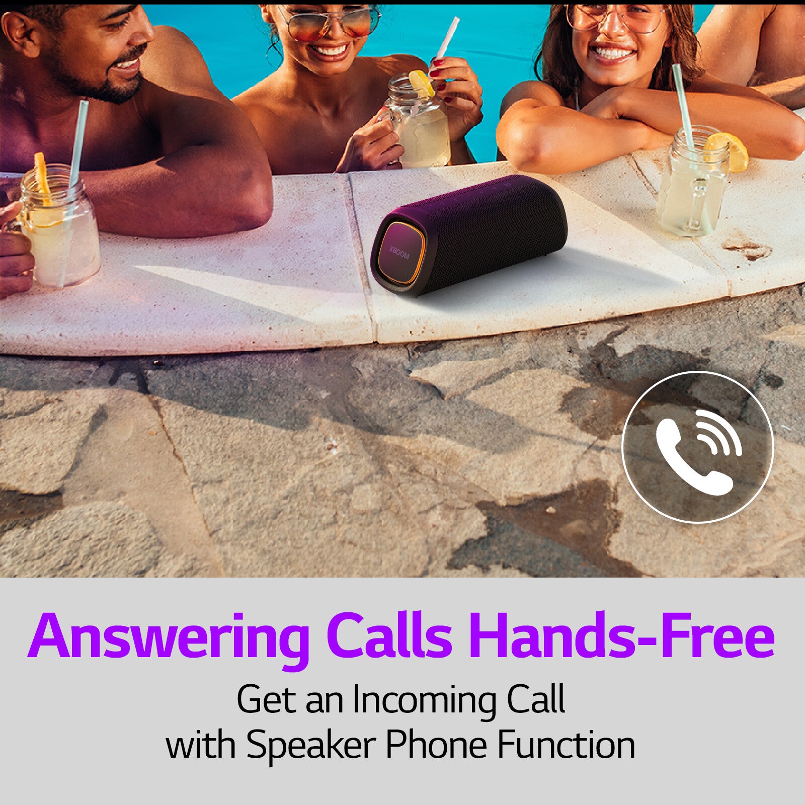 LG XBOOM Go makes sure you get an incoming call while the music plays. It switches so you can chat hands-free.