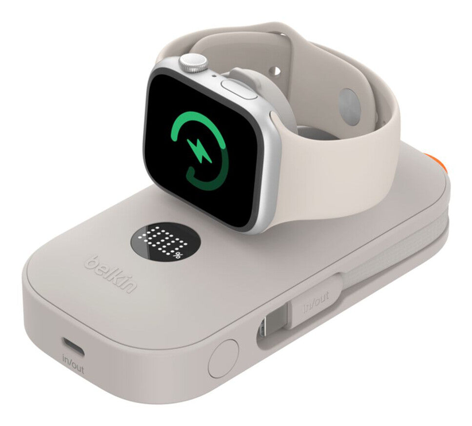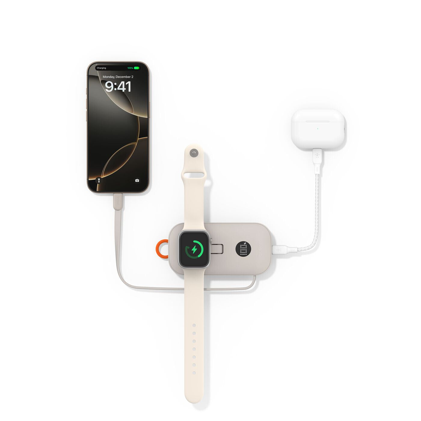 Fast charge your iPhone, Apple Watch, and any USB-C device all at once with this ultra-compact 3-in-1 power bank. Featuring a built-in Apple Watch charger, integrated USB-C braided cable and USB-C port, you can fuel everything from smartphones to gaming consoles while on-the-go. Made using recycled materials, it comes with a digital display and keychain loop to travel smarter.