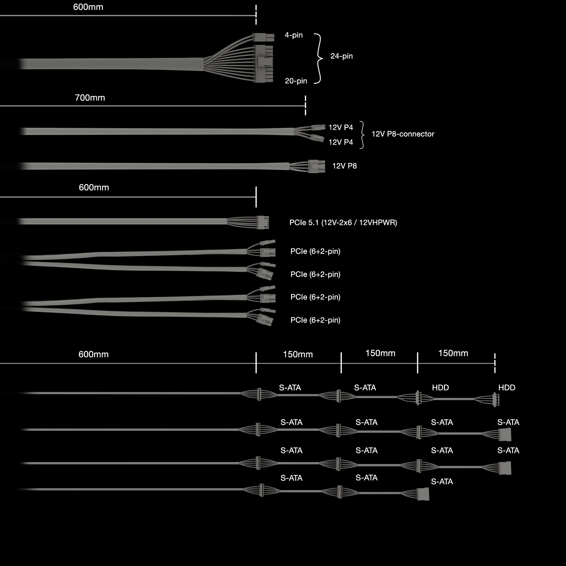 Dark Power 14 1000W is an ATX 3.1 PSU and comes with both native integration of the 12V-2x6 connector for next-generation PCIe 5.1 graphics cards and 4 PCIe 6+2-pin connectors for support of current-gen GPUs. This makes the PSU extremely versatile and perfect for current and future high-end systems.