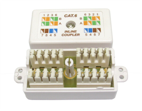 CAT 6 Punchdown Krone coupler in white for connecting Cat 6 cables, suitable for solid Cat 6 and colour coded for easy installation.