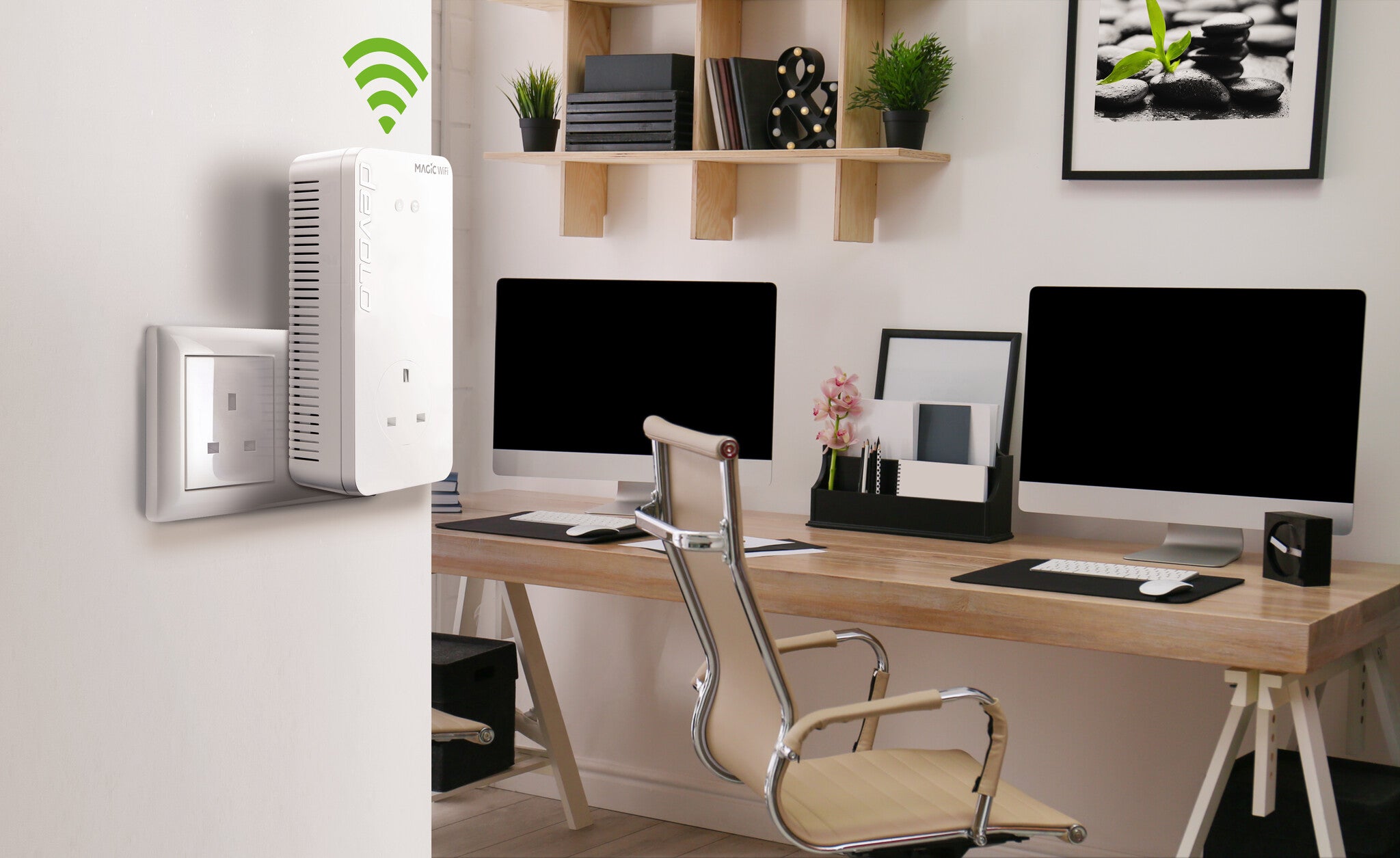 When it comes to home offices, reliability without compromise is what counts. So that your work results are not impaired by poor connection quality or slow downloads, devolo Magic 2 WiFi 6 supports you with high-speed Internet directly from the socket.