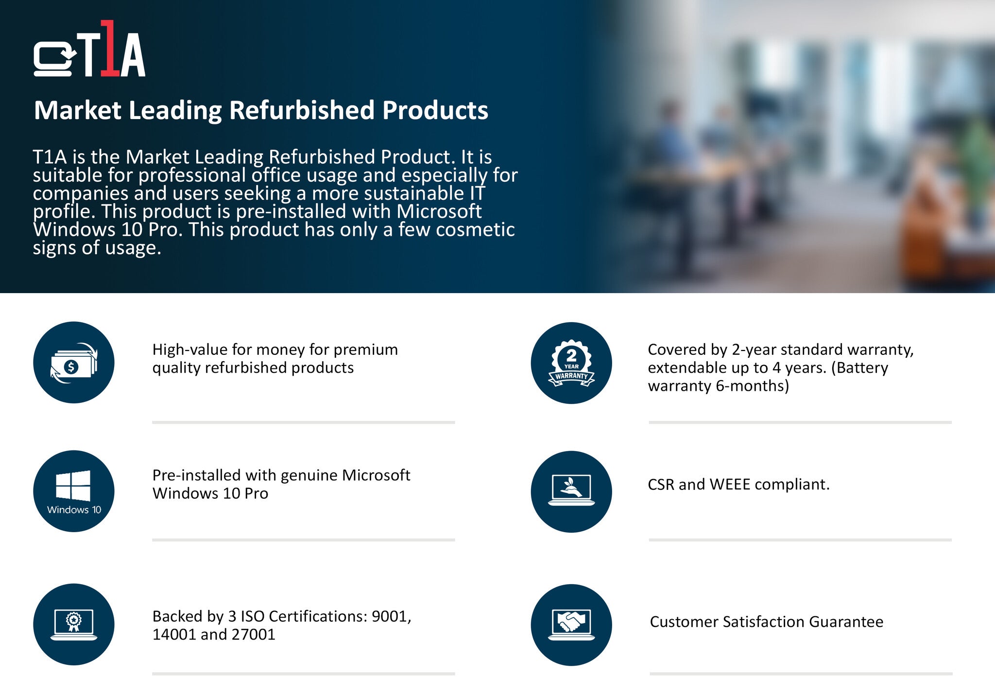 T1A is the Market Leading Refurbished product. It is suitable for professional office usage and especially for companies and users seeking a more sustainable IT profile. This product has only a few cosmetic signs of usage.