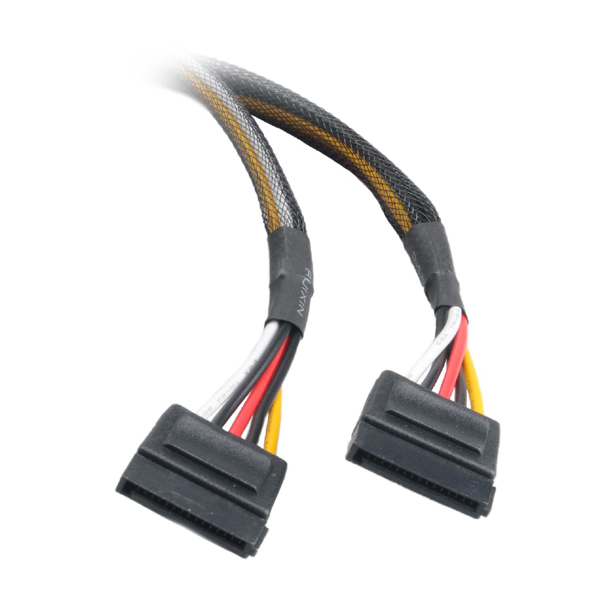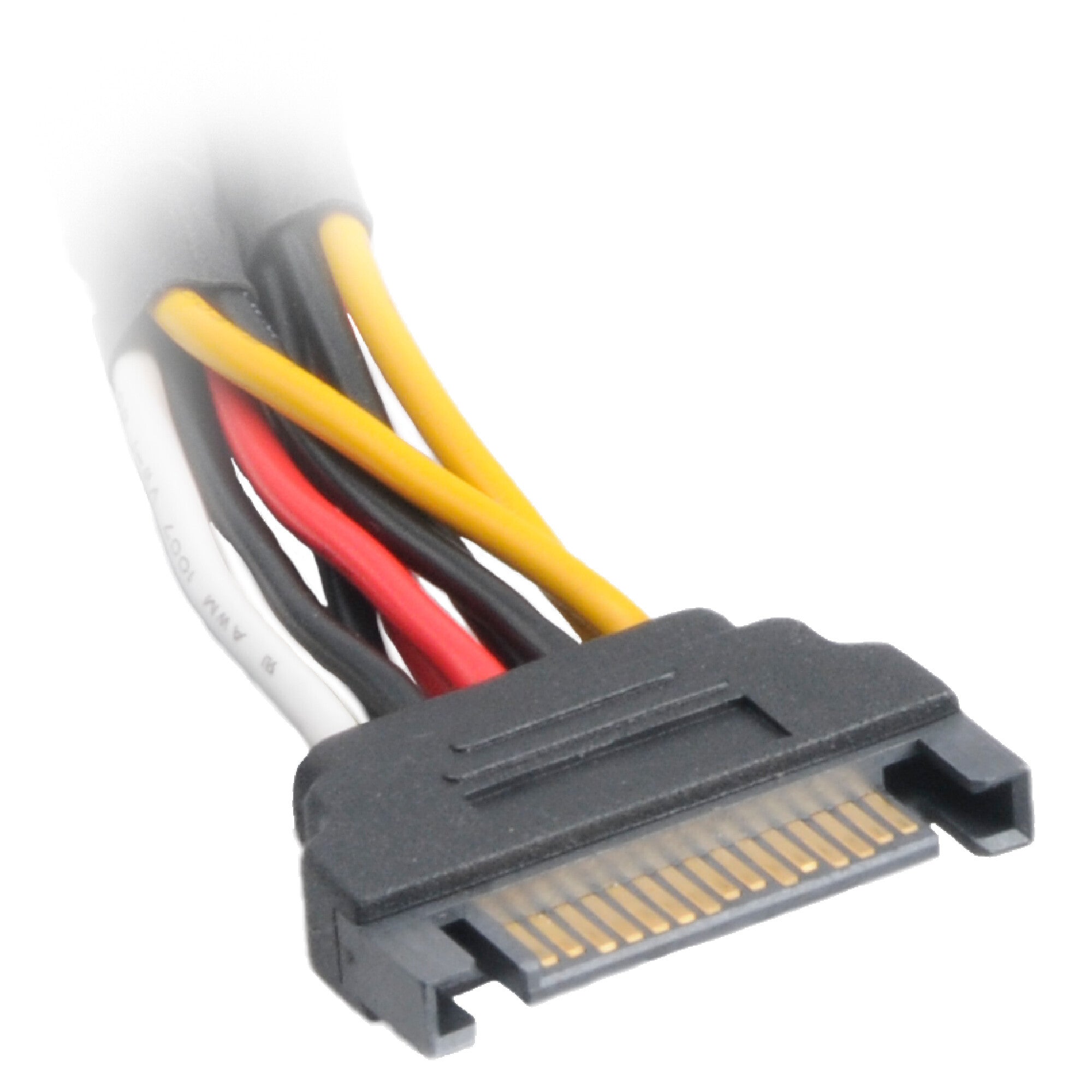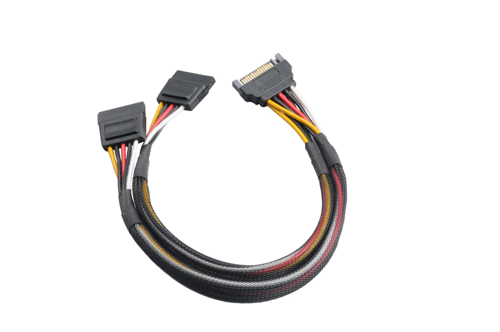 - Male 15pin SATA PSU connector to two 15pin SATA female power connectors