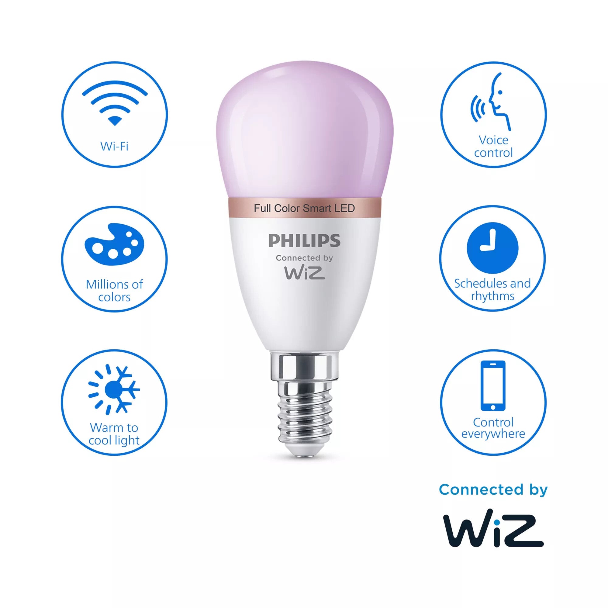 Use colourful shades of light in your interior spaces with the Philips smart LED full-colour smart bulb with an E14 base. This bulb is WiZ-connected. Use with your existing Wi-Fi to control with the