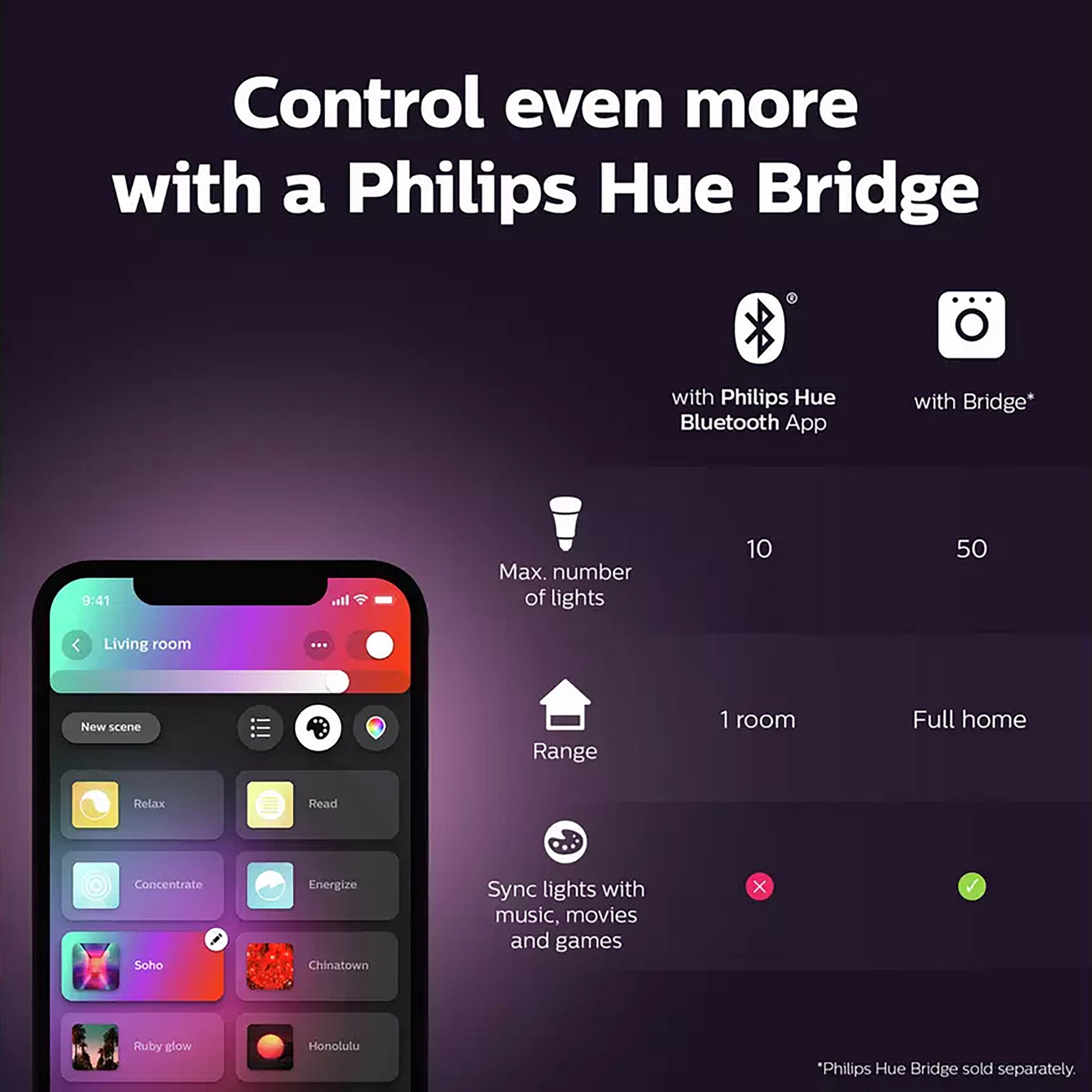 - Unlock full suite of smart light features with Hue Bridge