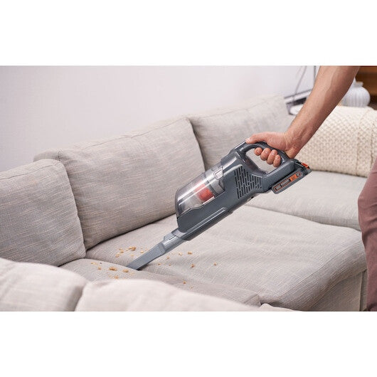 For high-performance cordless cleaning, look no further than the BLACK+DECKER POWERSERIES+ BHFEA18D1 Stick Vacuum. Designed to deliver 25% more pick up, this multi-functional stick vac gives you up to 40 minutes of runtime with no loss of suction. Perfect for all floor types, its special FloorSense technology automatically adjusts the speed and power, increasing suction on thick carpets and rugs, and switching to ECO mode for lighter tasks and hard surfaces. This efficient system also helps save battery power for even longer cleaning time without interruption. A built-in charge indicator will let you know when the vacuum cleaner needs recharging. Reaching every corner of the home, the BHFEA18D1 comes with a long, detachable floor extension. It also features a built-in LED light for maximum visibility in those harder-to-clean places, such as under the sofa or bed. Once the floor extension is detached, your POWERSERIES+ is transformed into a powerful 2-in-1 hand vac, for effective cleaning of awkward and high-up places. A generous removable, easy-to-empty 500ml dust bowl means you’ll spend less time emptying, while the innovative cyclonic filter system separates large particles from fine debris, reducing clogging and maximising performance. The easy-to-clean filter also ensures constantly powerful cleaning. Thanks to its user-friendly design, the POWERSERIES+ comes complete with a simple-to-remove beater bar. This attachment is also effortless to clean. For tackling the tightest corners and narrowest places, the versatile POWERSERIES+ BHFEA18D1 stick vacuum is supplied with a handy crevice tool, while a durable wall mount enables convenient storage. This model includes a removable 18V 2Ah battery, delivering all the runtime, performance and power you need for a thorough home cleaning routine.