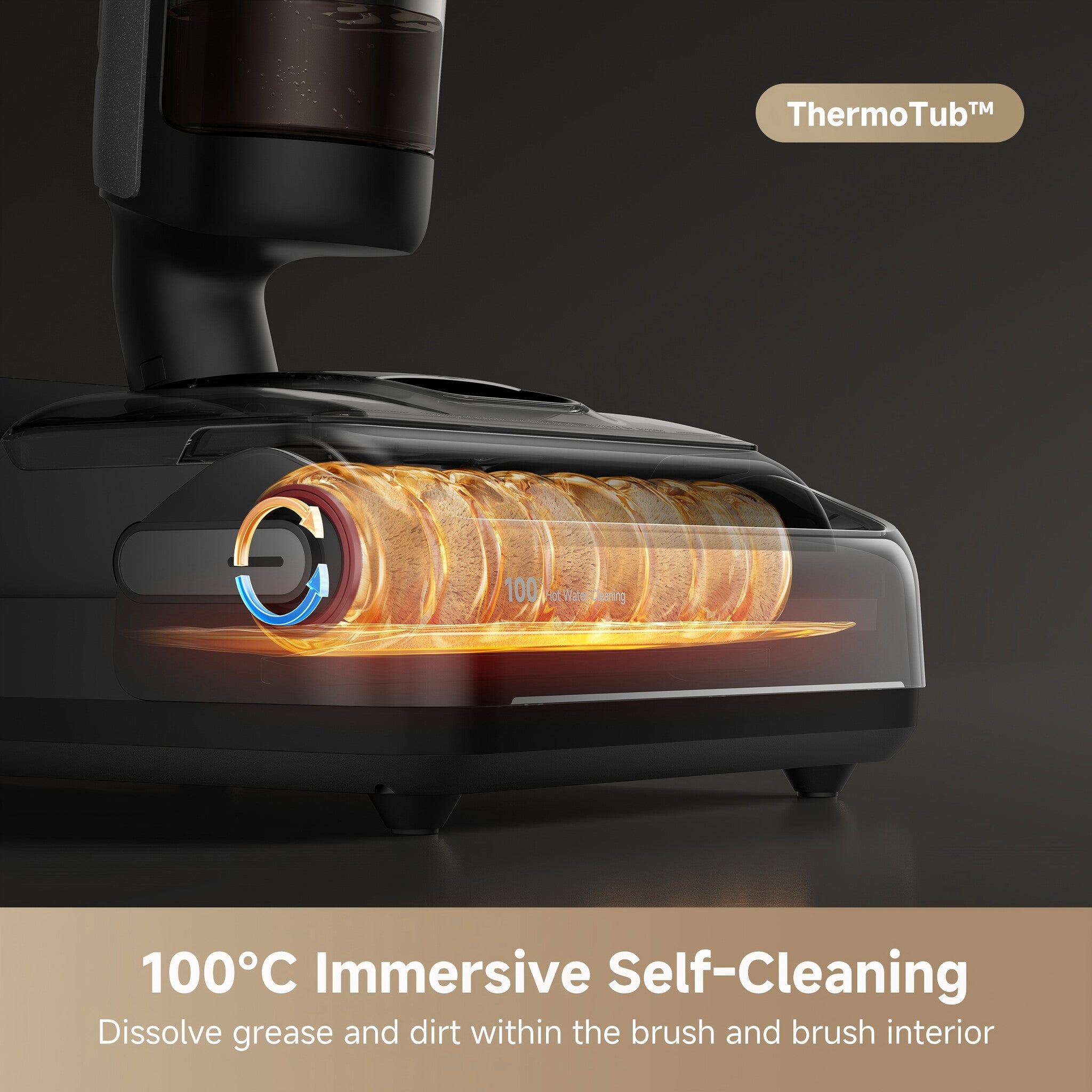 H15 Pro revolutionizes floor cleaning with GapFree™, using an AI lifting robotic arm for triple edge coverage to eliminate tough front gaps while leaving nearly 0 liquid stains. Its 180° lie-flat performance is secured with unlost suction and 21kPa power effortlessly tackles solid and liquid debris. Featuring the TangleCut™ resilient scraper, the brush easily cuts hair tangles to prevent manual detangling while GlideWheel™ helps you with easy gliding. During self-cleaning, ThermoTub™ immerses and rinses the brush in 100°C hot water and quietly dries it with high-speed 90°C air in just 5min.