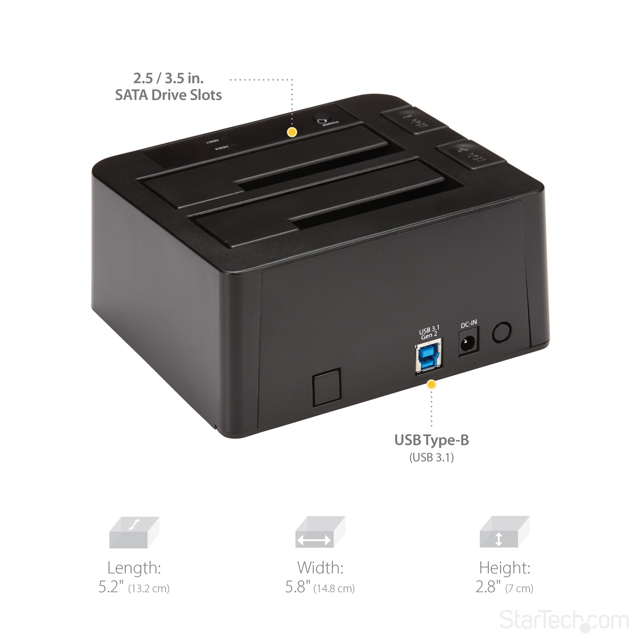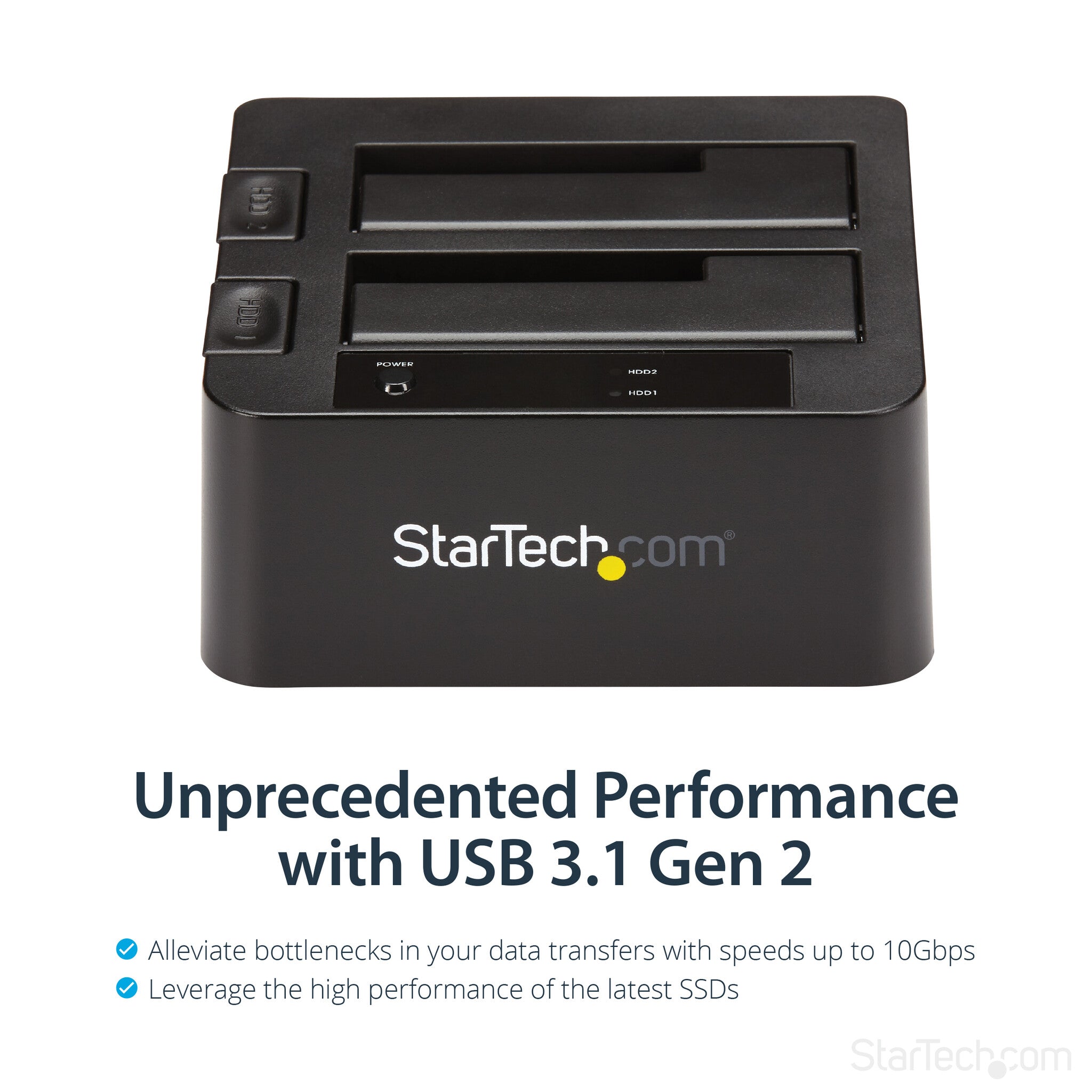- SPECS: 2-Bay Hard Drive Dock / SATA I/II/III (1.5/3/6 Gbps) / USB 3.2 Gen 2 (10 Gbps) Host Connection / Tool-less/Tray-less Design / Hot-Swappable Drive Bays / Top-Loading/Toaster-Style with Eject Buttons / LED Activity Lights