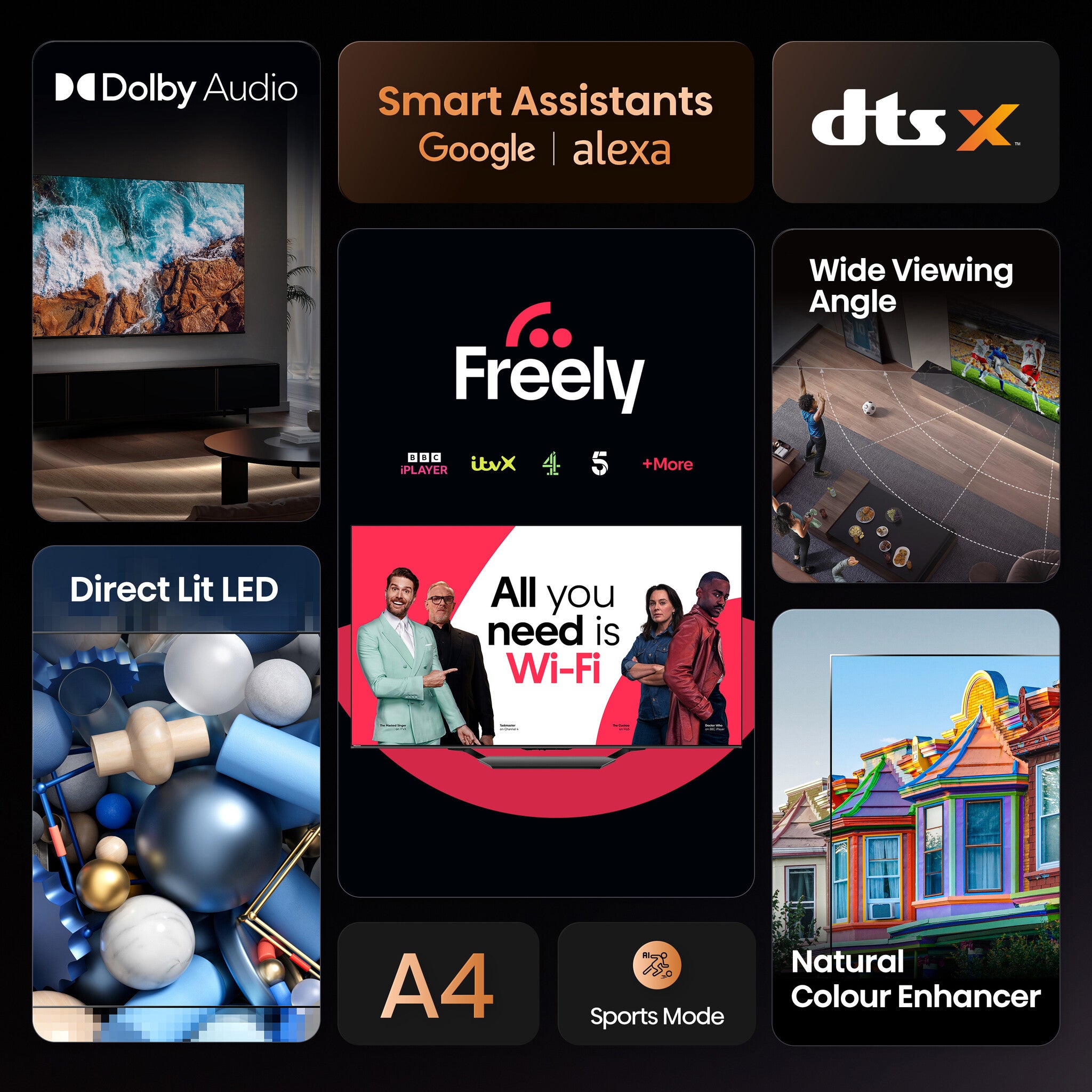 The Hisense E4Q TV delivers stunning picture quality with Direct Lit LED technology and Natural Colour Enhancer, ensuring vivid colours and deep blacks for a truly immersive experience. Enjoy seamless access to live and on-demand content with Freely, while Dolby Audio and DTS Virtual X provide superior sound that puts you at the centre of the action. A wide viewing angle ensures everyone gets the best seat in the house, and the VIDAA Smart platform offers an intuitive gateway to all your favourite streaming services. Hands-free control is effortless with Smart Assistants, while Sports Mode enhances every game with lifelike clarity. Game Mode delivers ultra-smooth gameplay with low input lag, and built-in Wi-Fi, along with multiple HDMI ports, keeps you always connected.