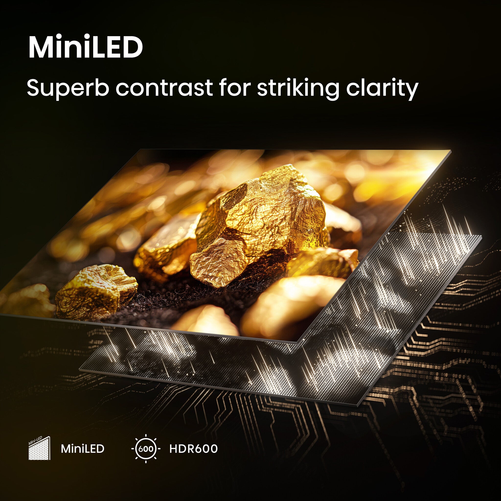 The E8Q refines home entertainment with cutting-edge advancements in picture, sound, and smart technology. MiniLED PRO enhances brightness, contrast, and colour with precise dimming zones, supported by 144Hz panel technology and Mini-LED HDR600. The Hi-View AI Engine upscales content in real time, while 144Hz Game Mode PRO with VRR and AMD FreeSync Premium PRO ensures ultra-smooth gameplay. Immersive audio is delivered through a built-in subwoofer, Dolby Atmos, and DTS Virtual X, creating a rich 2.1 channel surround sound. Quantum Dot Colour brings over a billion shades to life, while anti-reflection and wide-angle technology ensure Every Seat is a VIP Seat. Dynamic Tone Mapping and Dolby Vision IQ optimise HDR for stunning clarity in any lighting.The VIDAA U9 Smart Platform offers seamless access to Freely, Disney+, Netflix, and more, with Hands-free Voice Control and smart assistant integration. Filmmaker Mode and IMAX Enhanced bring cinematic visuals home, while Smart Gaming and Sports Mode ensure fluid action and realism. Sleek in design, the bezel-less E8Q features a Solar Remote for sustainable power. Go Greener initiatives, including adaptive light sensors and energy-saving modes, reduce environmental impact. WiFi, Bluetooth, and screen casting keep you connected.