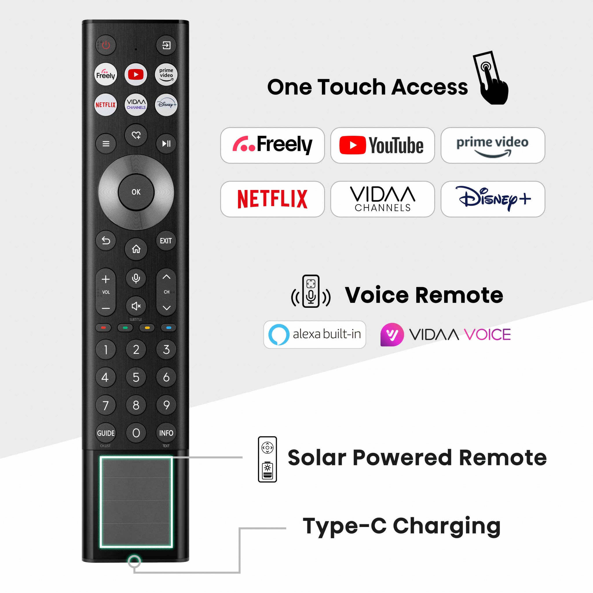 Our new solar charging remote removes the need for replacing batteries. Using ambient light its always charging, so you have power no matter the time of the day. With multiple quick access buttons to your favourite streaming services. The newsolar powered multi-function remote makes controling the TV seamless.